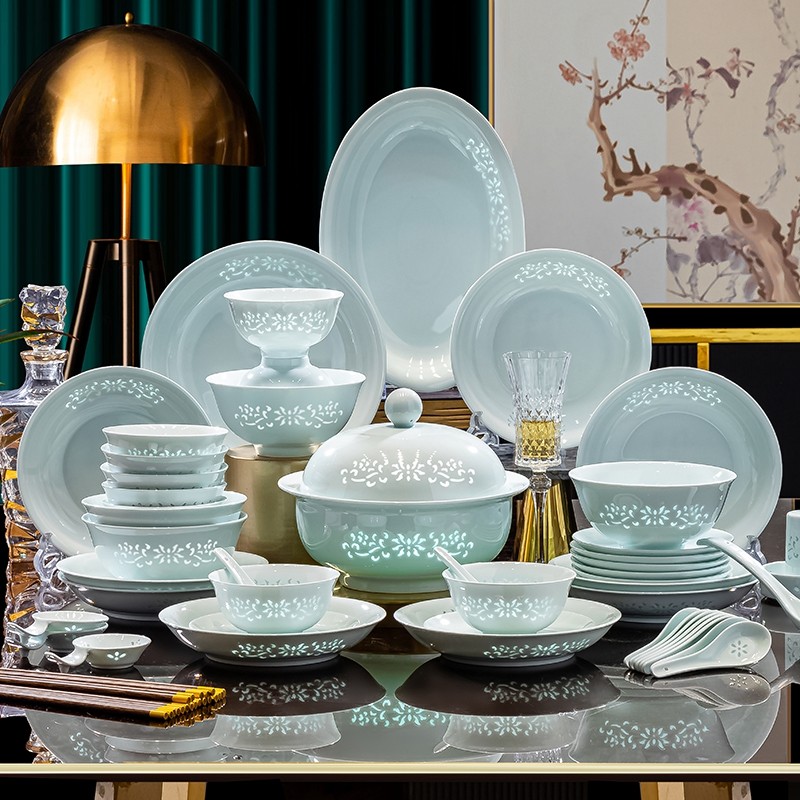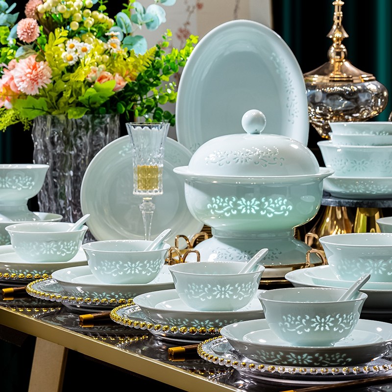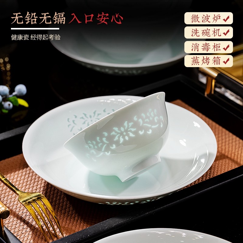 轻奢单个饭碗盘子碟家用组合景德镇高温玲珑瓷釉下彩餐具可微波炉