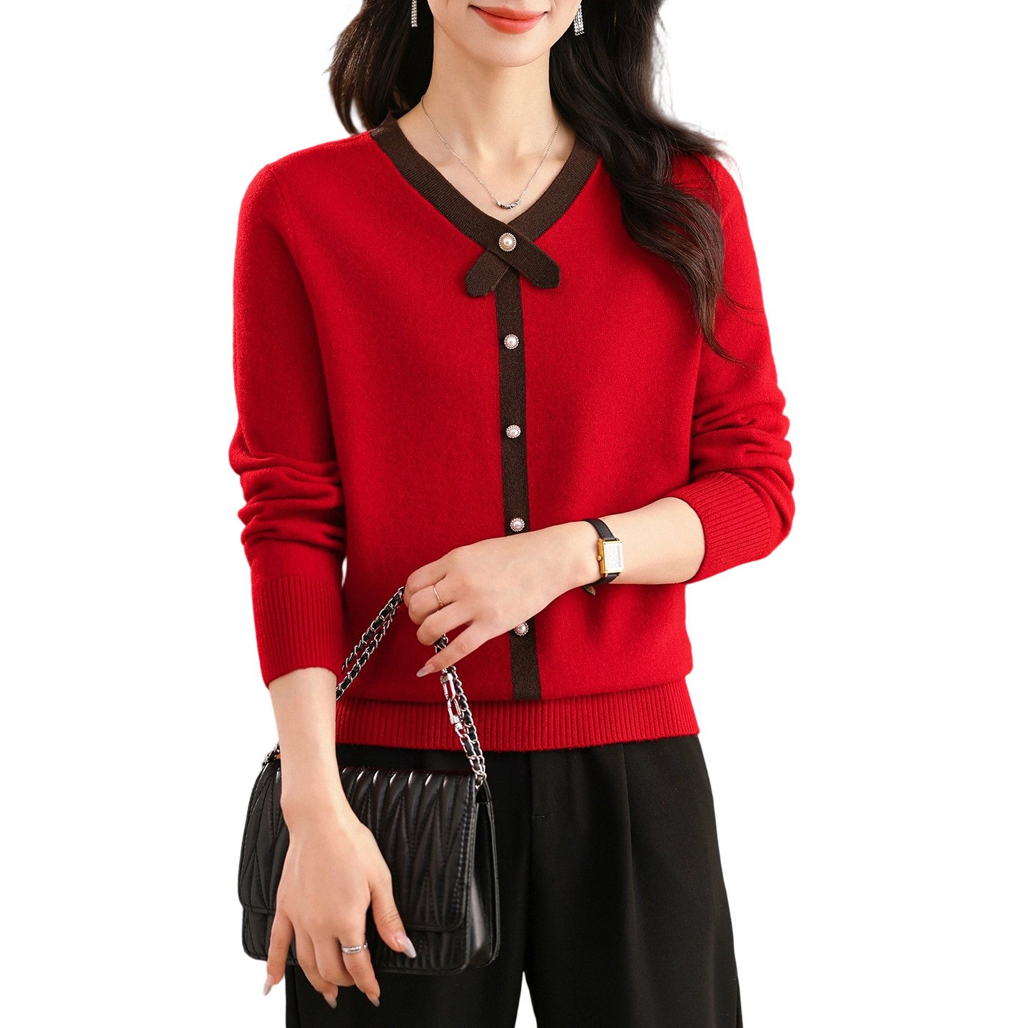 恒源祥2025年新款红色针织衫毛衣100纯羊毛衫上衣中老年妈妈女装