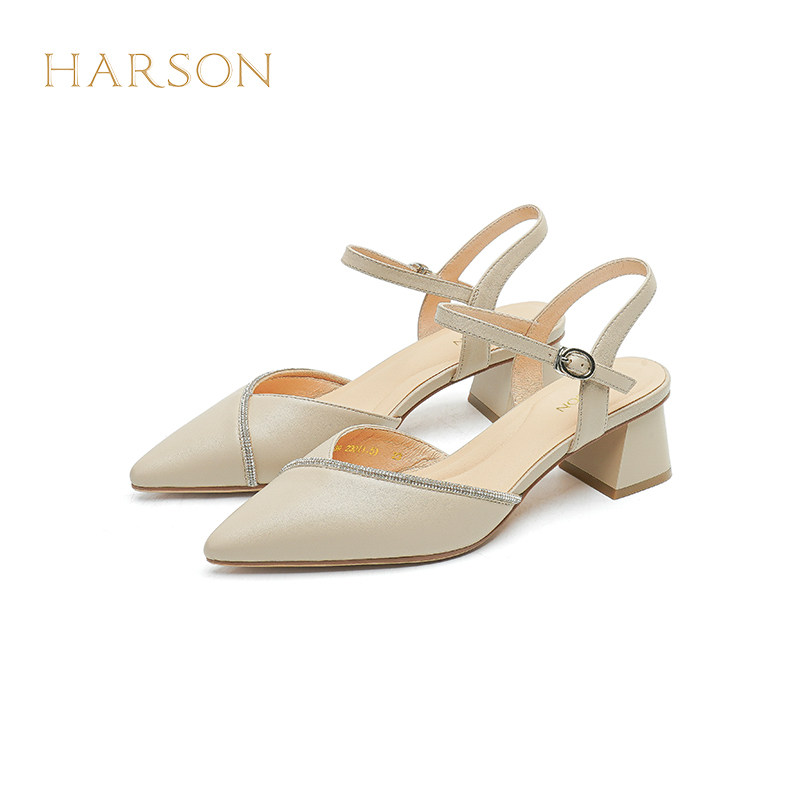 哈森夏季新款尖头水钻羊皮革一字带包头后空凉鞋粗跟HM237139