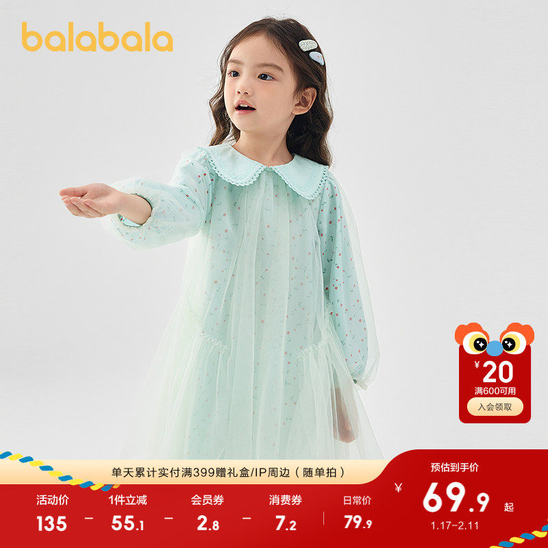 【balaOne】巴拉巴拉童装女童连衣裙2025新款春装网纱裙甜美洋气