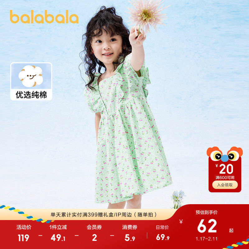 巴拉巴拉童装女童连衣裙夏季新款儿童宝宝甜美泡泡袖公主裙子纯棉