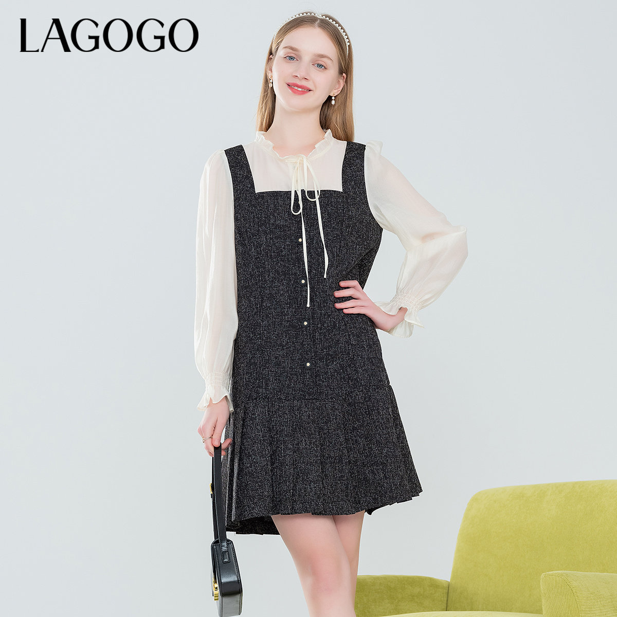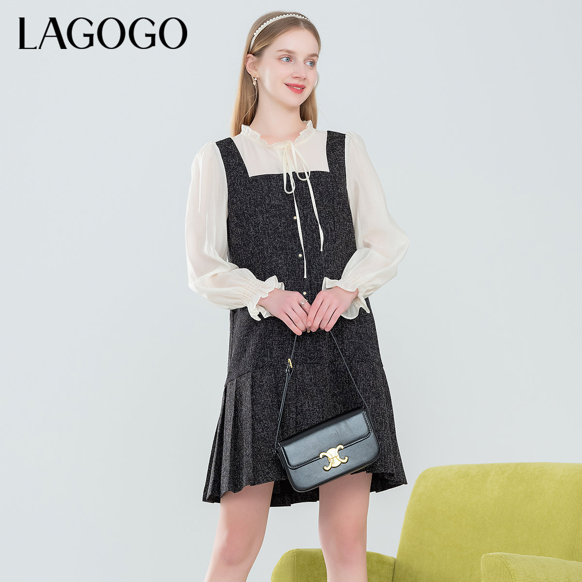 LAGOGO复古撞色拼接百褶裙拉谷谷春秋新款木耳边系带连衣裙女