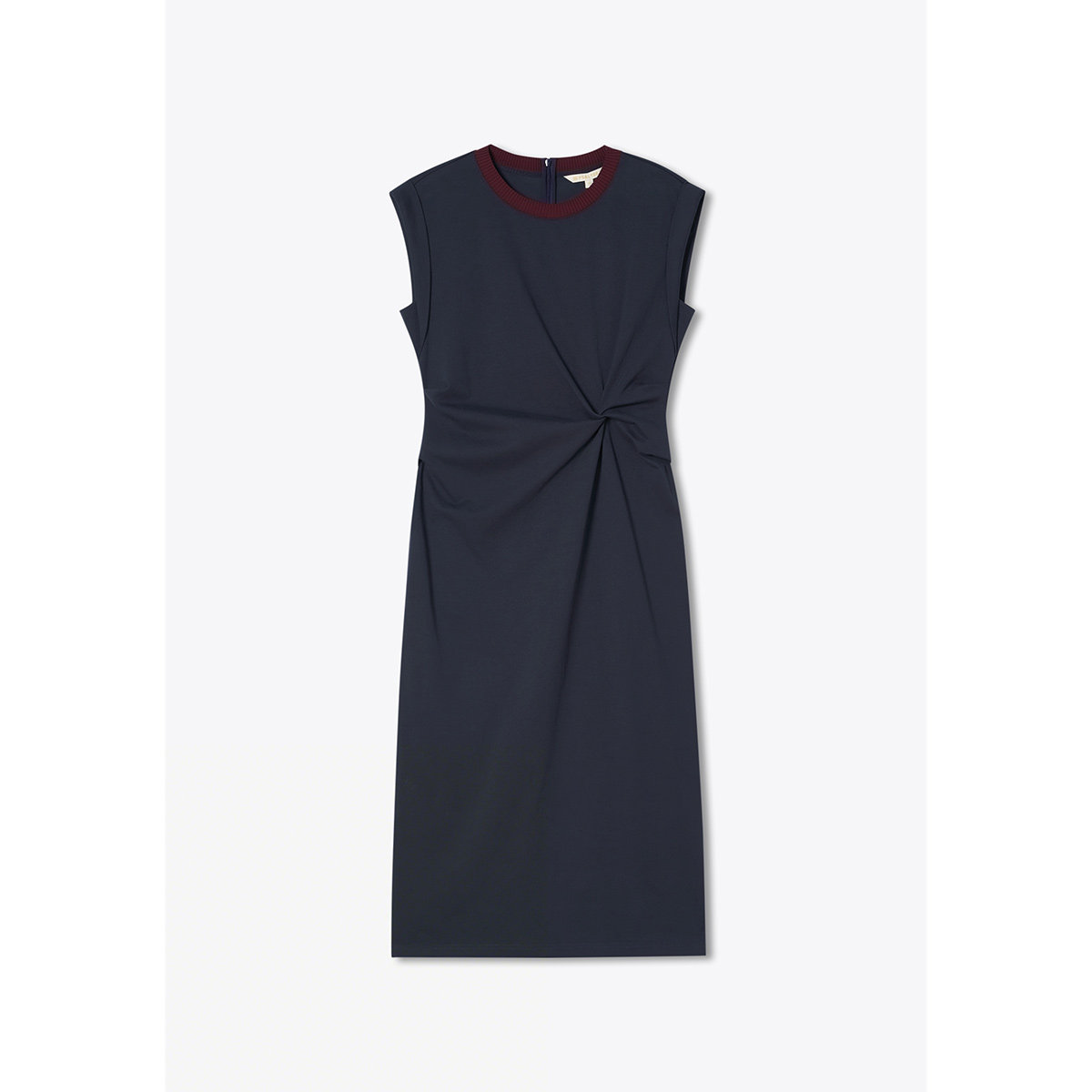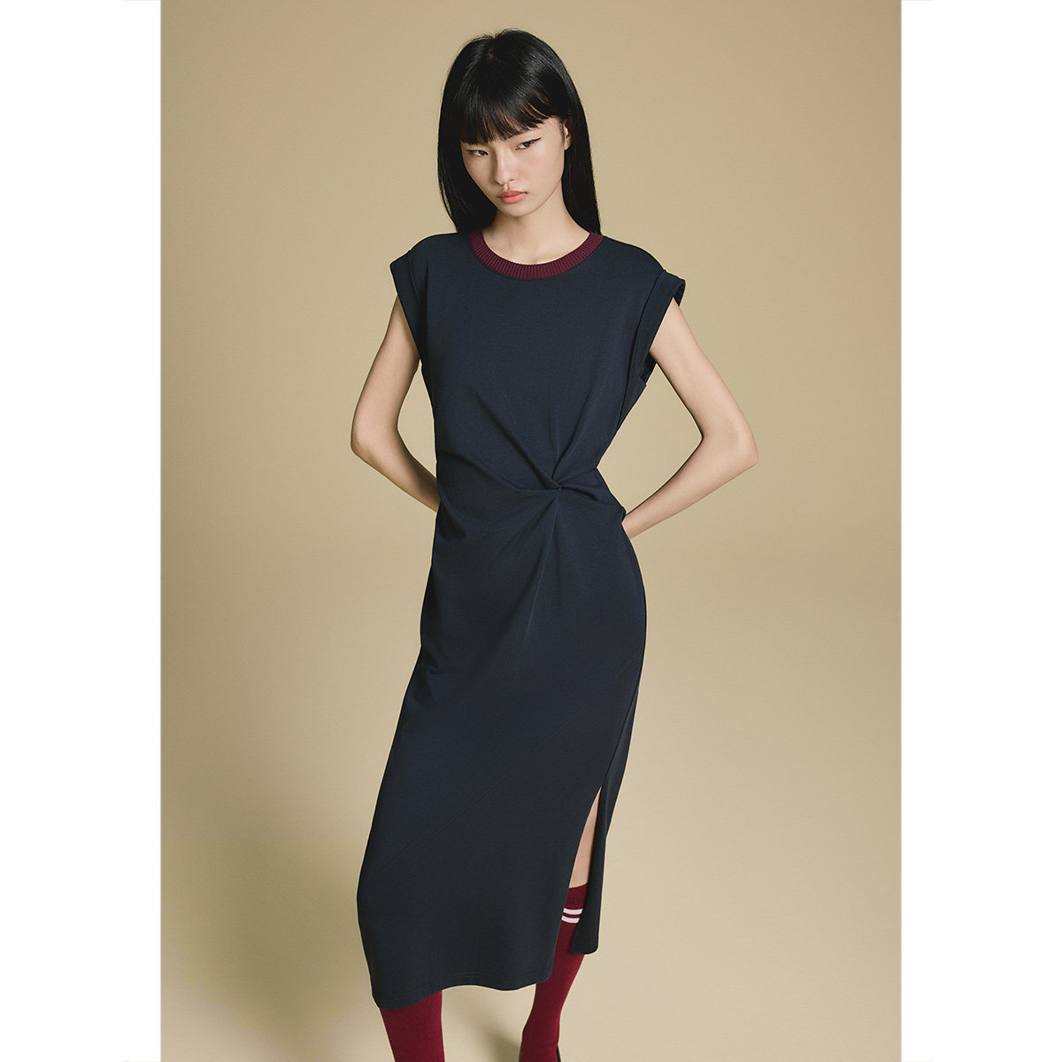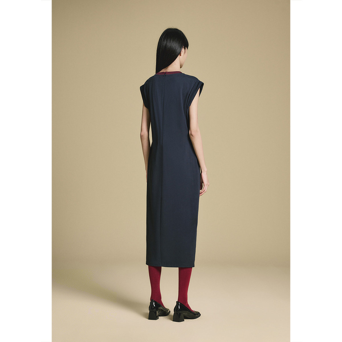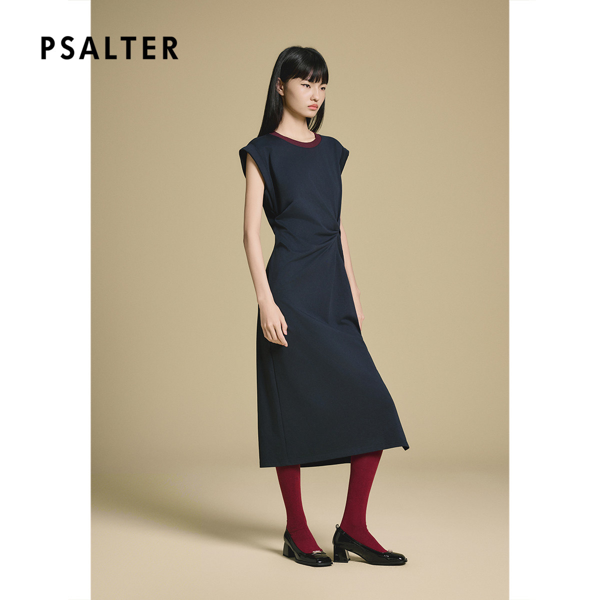 PSALTER诗篇藏蓝腰部捏褶显腰长款修身连衣裙2025秋款