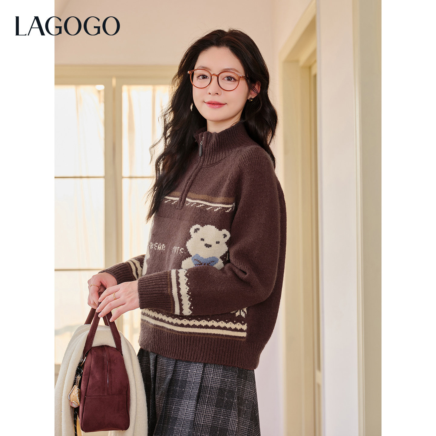棉花糖小熊LAGOGO半高领针织衫女拉谷谷2025冬季新款可爱提花毛衣