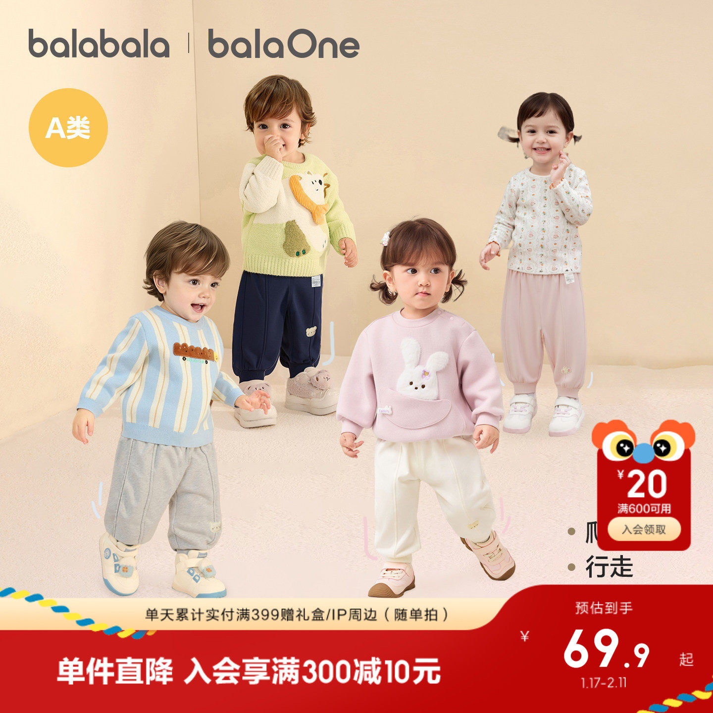巴拉巴拉童装宝宝长裤儿童加绒保暖裤2026新款冬春男童女造型萌趣