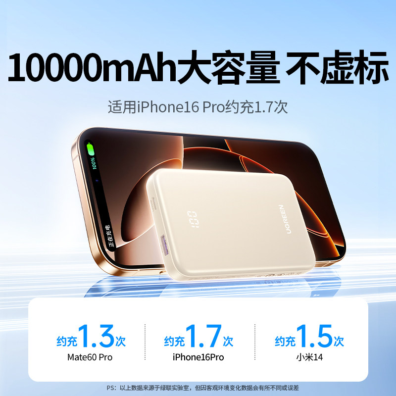 【充电宝3C认证可上飞机】绿联2025新款10000毫安充电宝适用苹果17专用快充自带线超薄小巧便携移动电源官方
