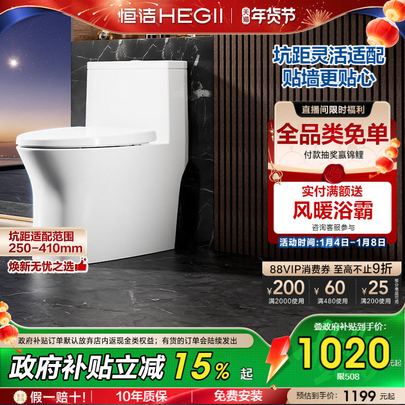 恒洁卫浴可调坑距马桶大冲力虹吸式节水佛山家用坐便器508