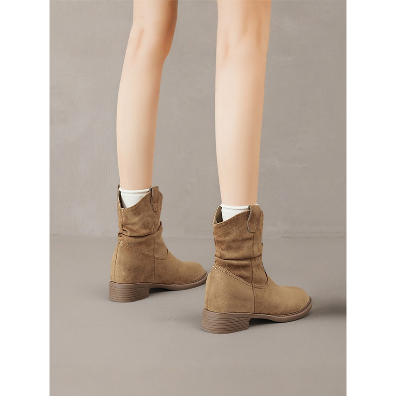 羊皮版~内增高靴子女2025新款爆款中筒粗跟短靴卡其色褶皱堆堆靴