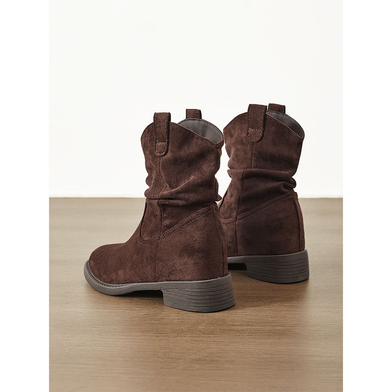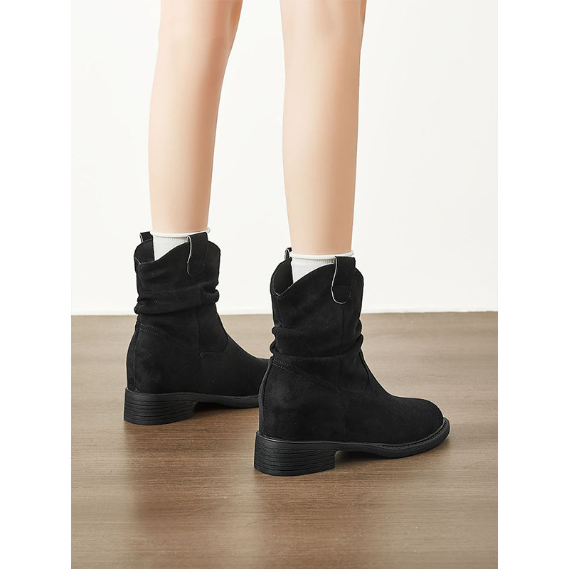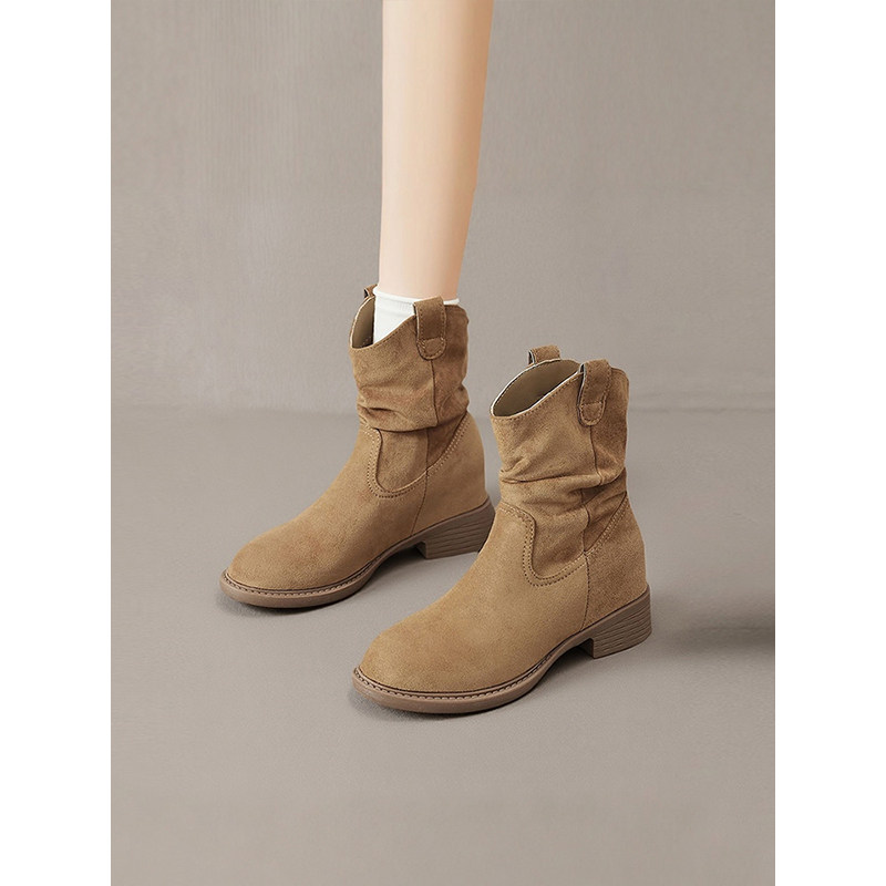 真皮~内增高西部牛仔堆堆靴女2025秋褶皱裤管短靴复古骑士马丁靴