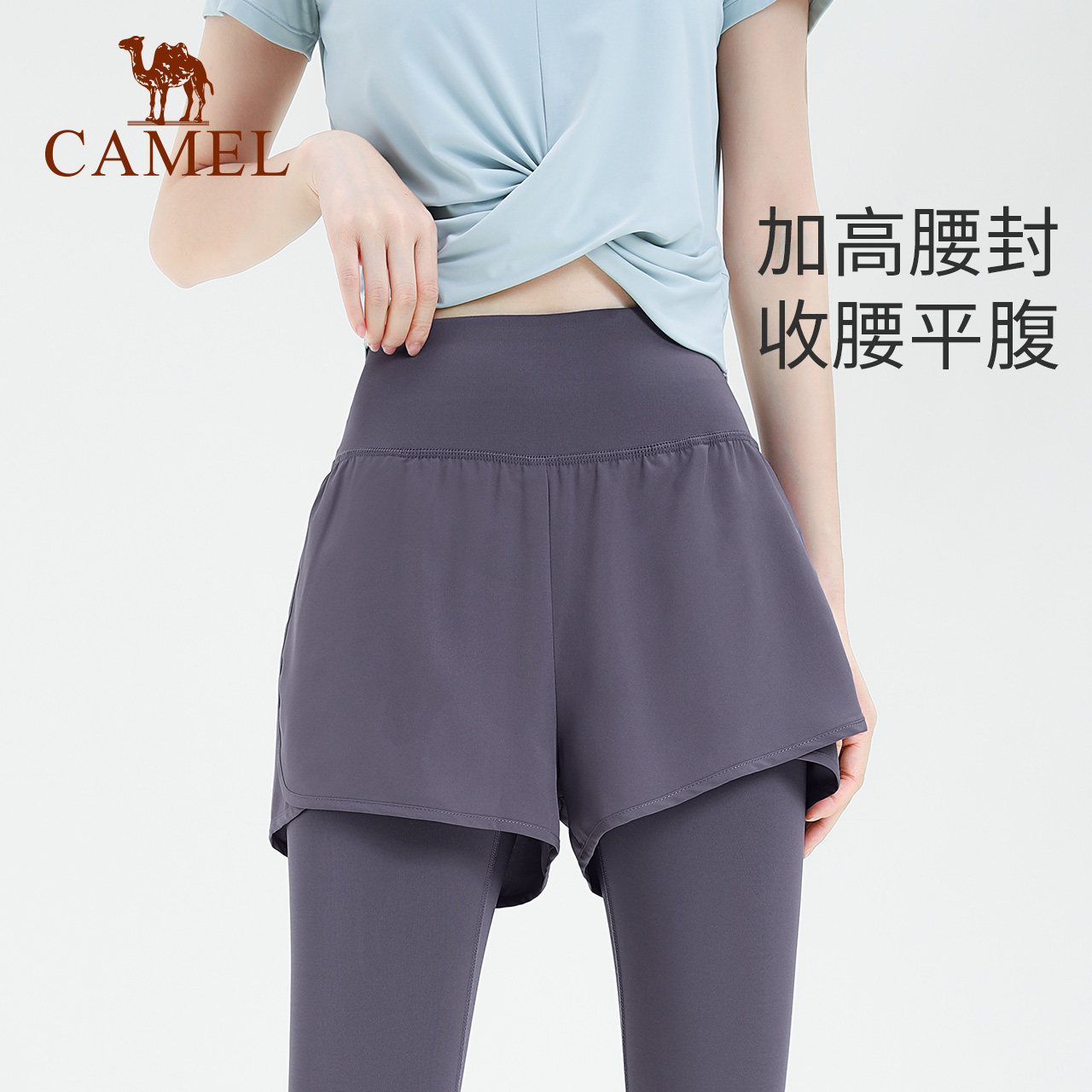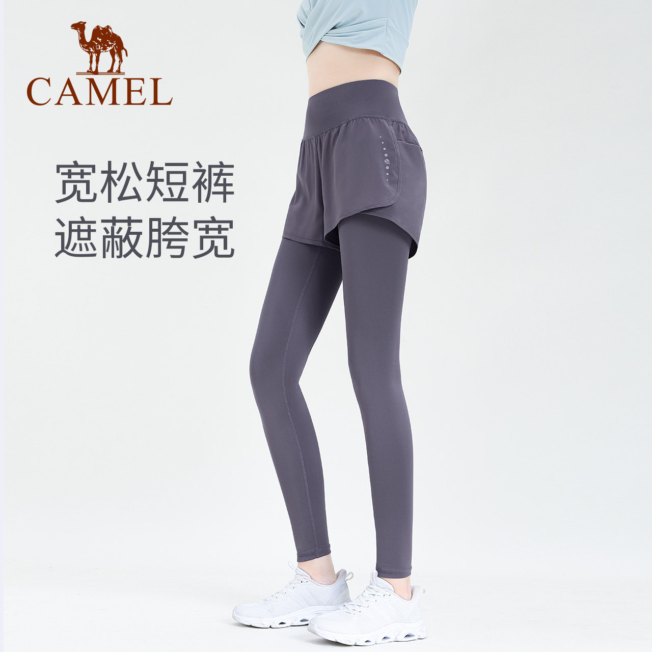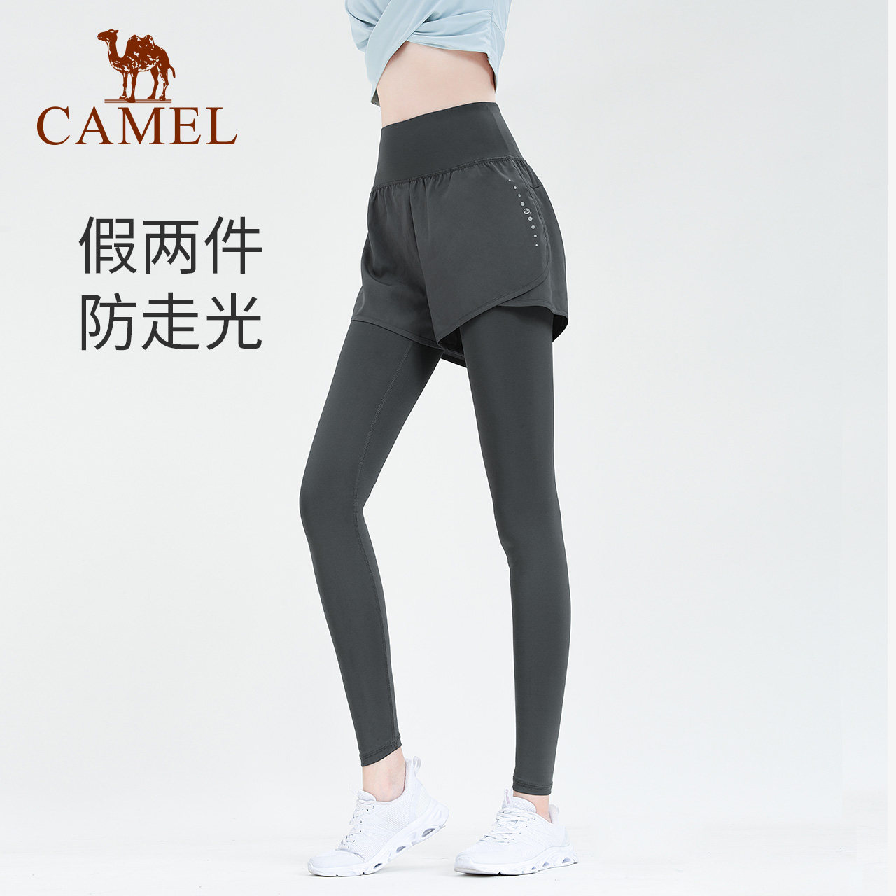 骆驼瑜伽裤女假两件运动裤弹力健身裤外穿紧身裤跑步裤防走光短裤