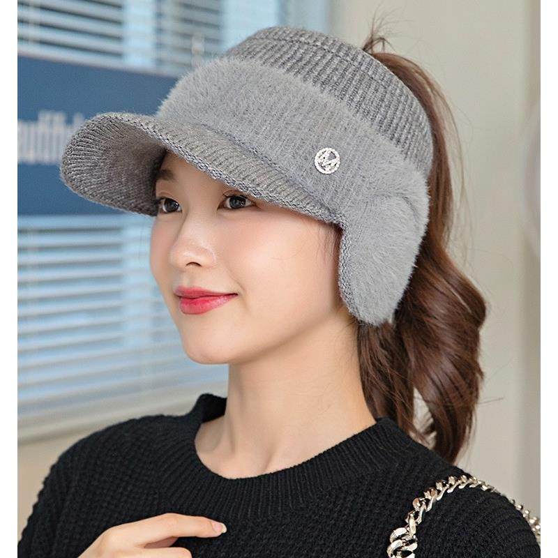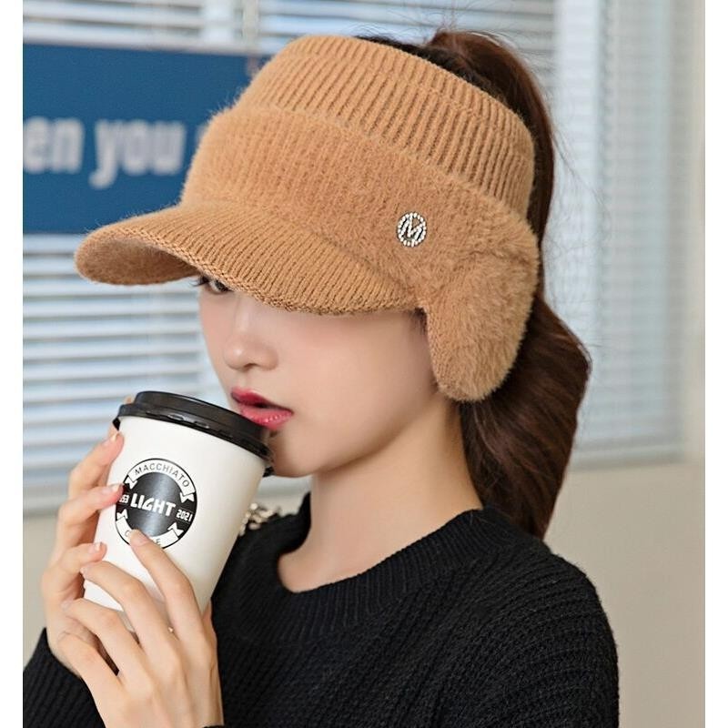 帽子女秋冬空顶加厚护耳保暖鸭舌帽韩版百搭防寒针织毛线帽潮黑色