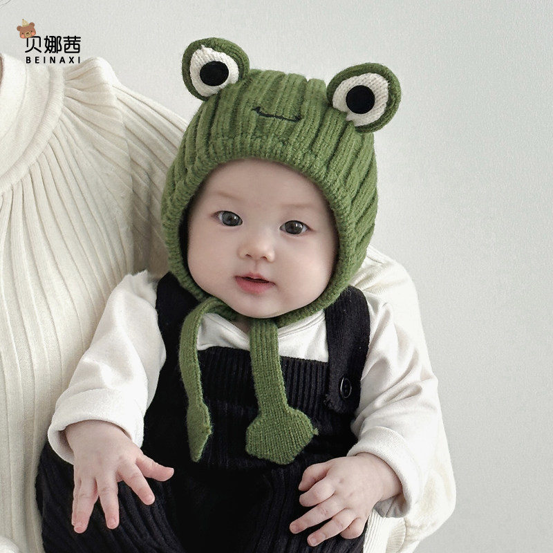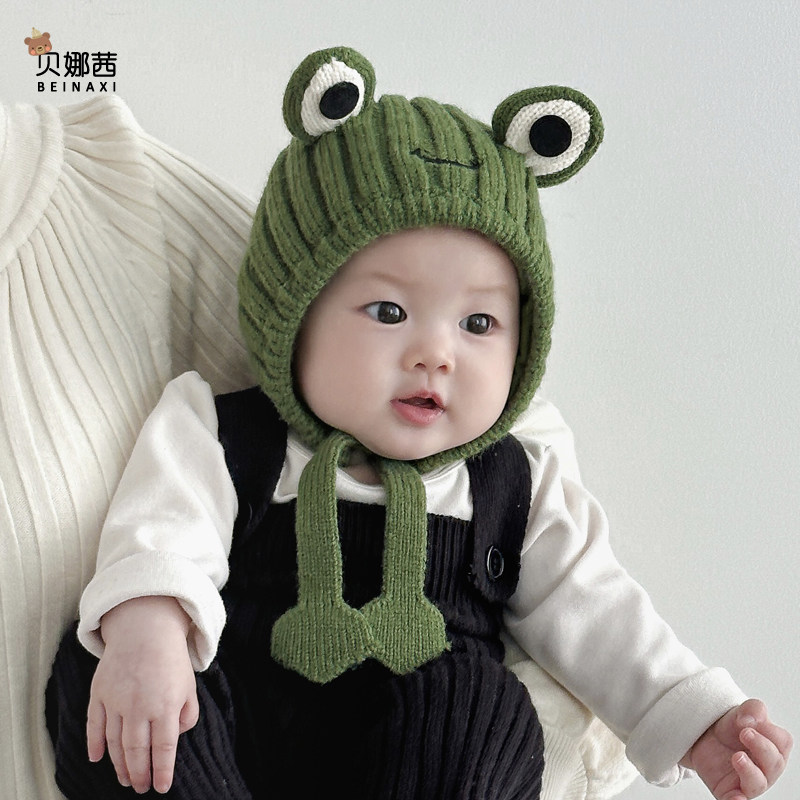 婴儿帽子宝宝秋冬季毛线帽男小月龄可爱小青蛙婴幼儿卡通护耳帽