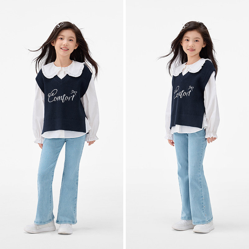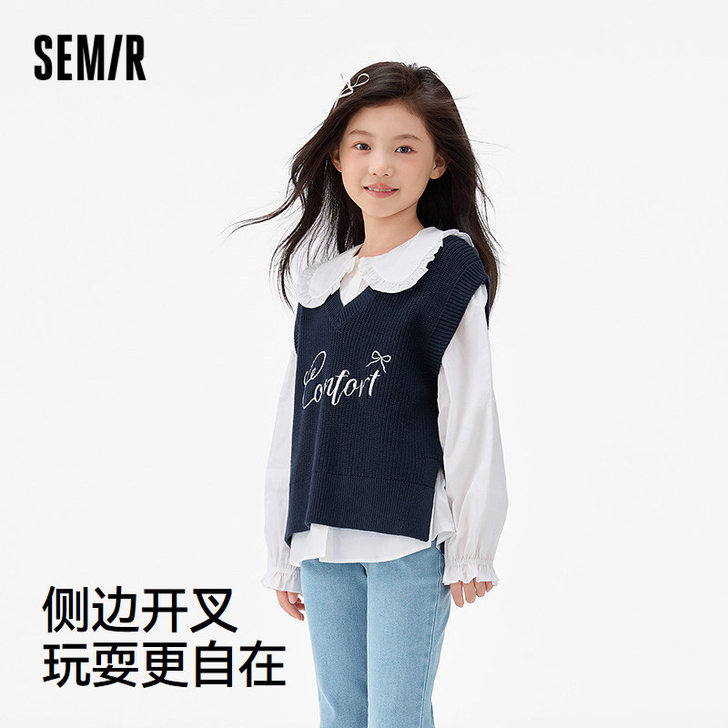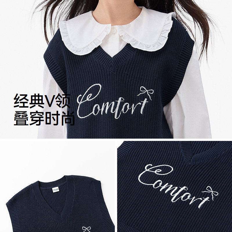 森马儿童25年秋季喜暖女中童背心V领毛衣字母刺绣内搭上衣针织衫