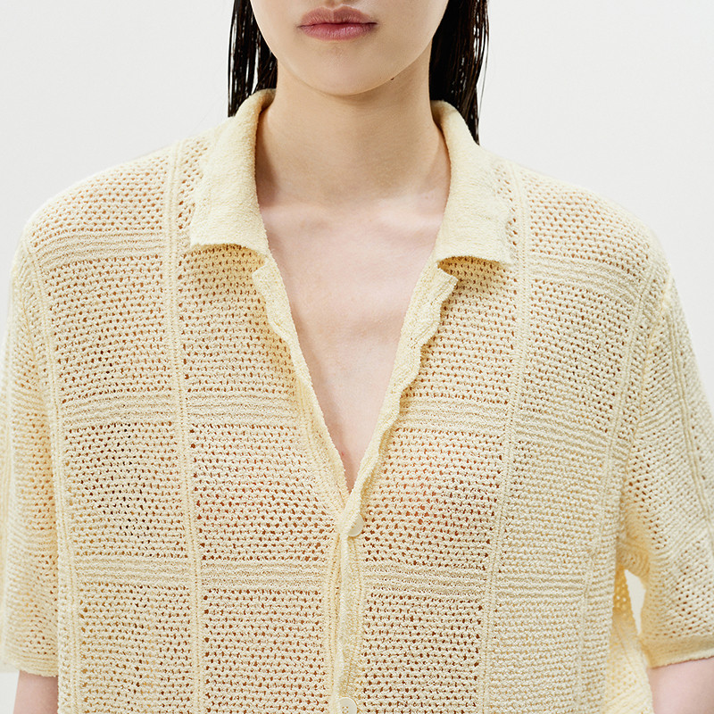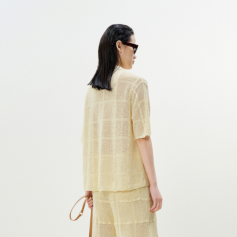 LESS夏季镂空针织开衫女简约编织度假风短袖翻领上衣2P4311190