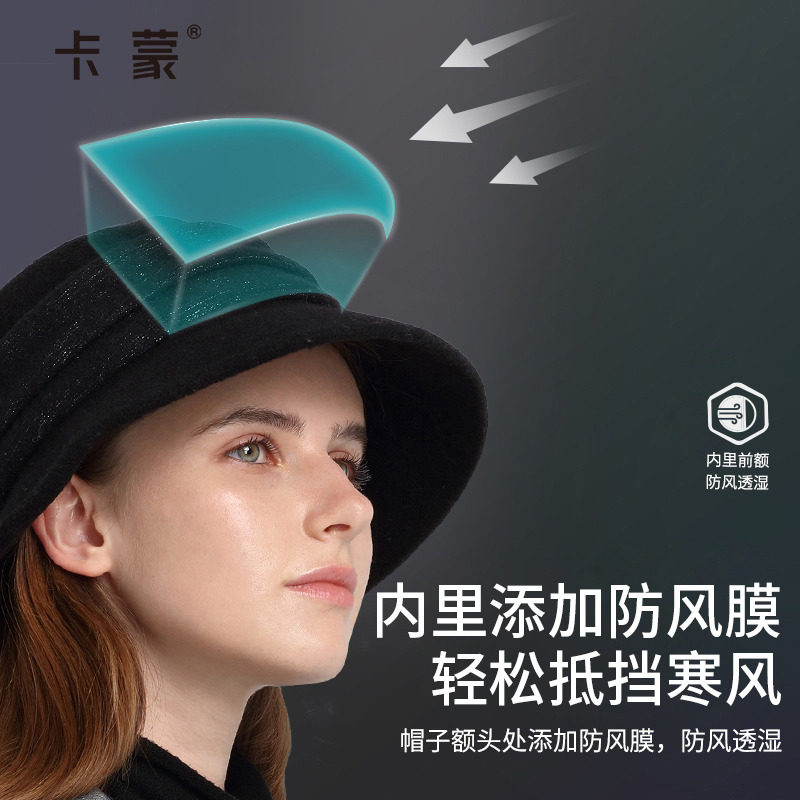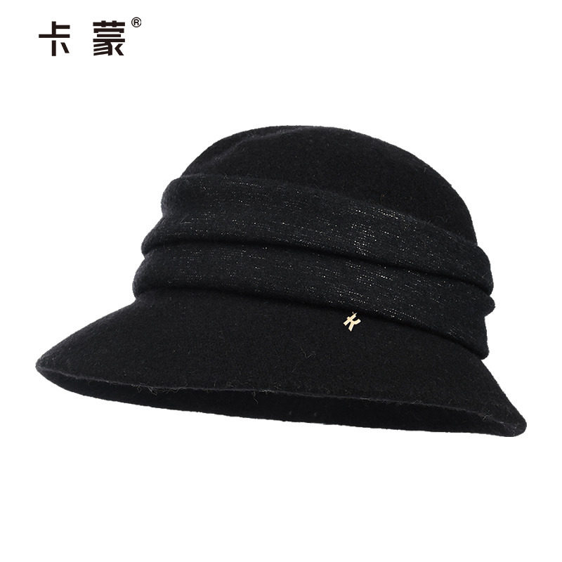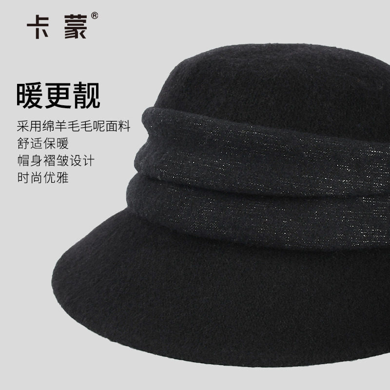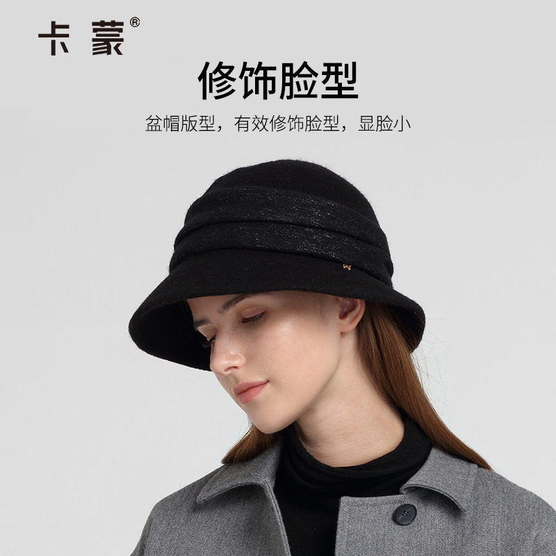 卡蒙百搭羊毛钟形渔夫帽女士秋冬保暖盆帽显脸小高端黑色毛呢帽子