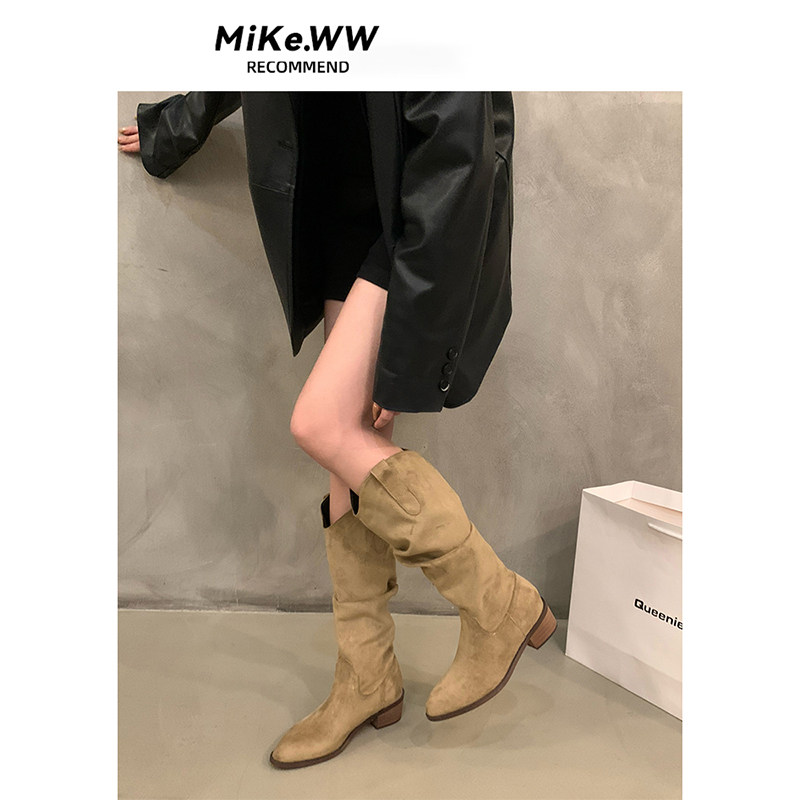 V口堆堆中筒长靴女鞋2025春秋冬季尖头西部牛仔长筒靴子绒面杏色