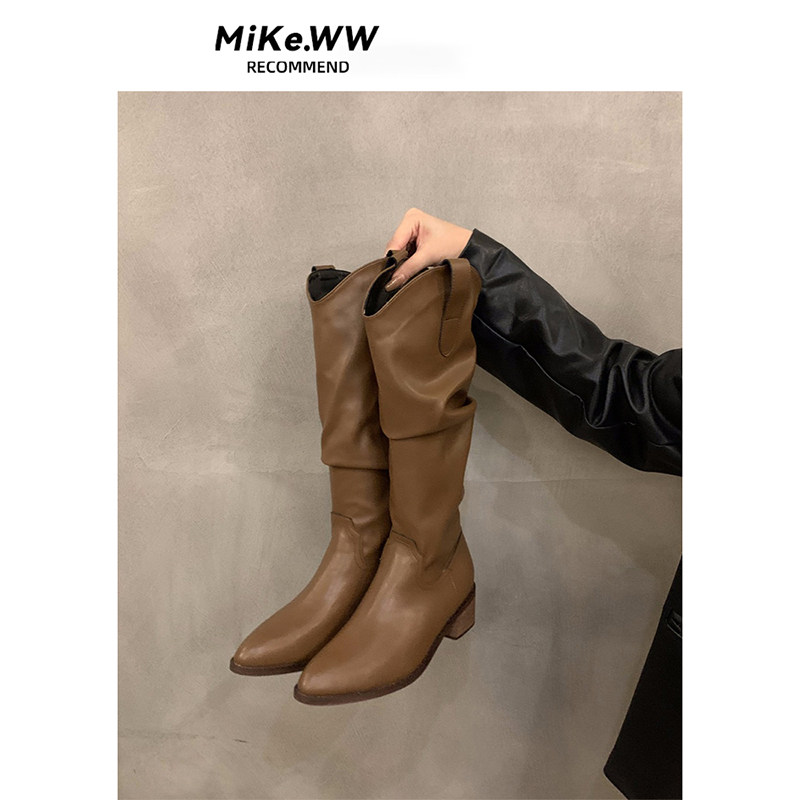 真皮~内增高粗跟骑士靴女秋冬西部靴高筒复古显瘦褶皱堆堆靴长靴