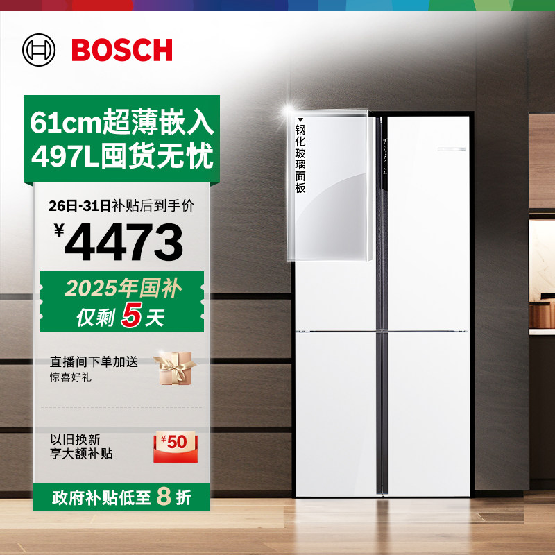 【以旧换新】博世小白鲸497L超薄嵌入冰箱家用一级玻璃十字四门