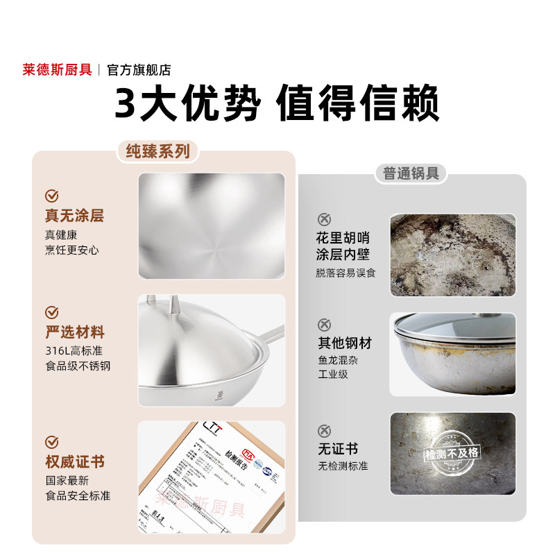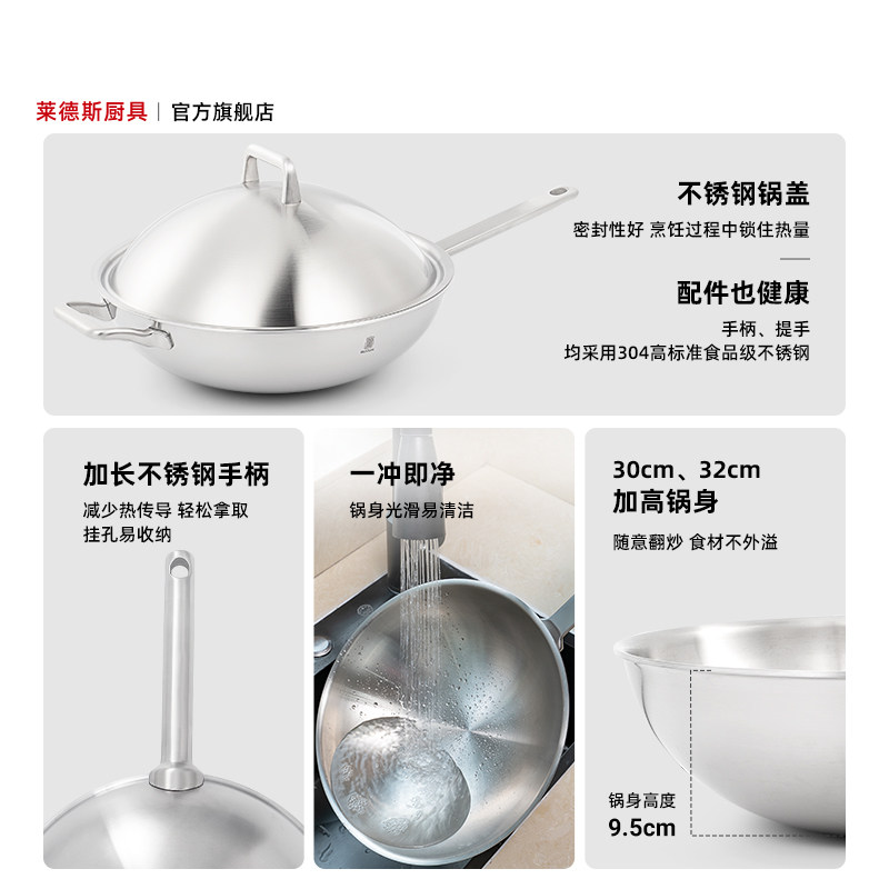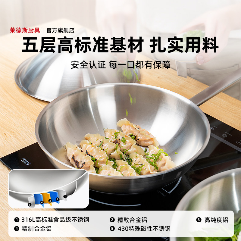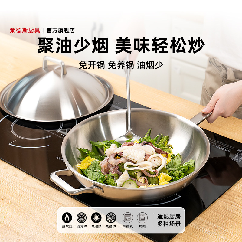 莱德斯316L不锈钢家用炒锅无涂层一体炒锅少油烟电磁炉燃气通用