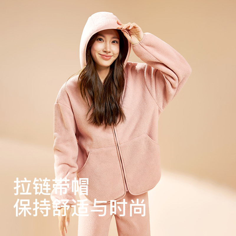 爱帝情侣家居服套装米粒绒春秋加绒加厚连帽睡衣冬开襟男女可外穿