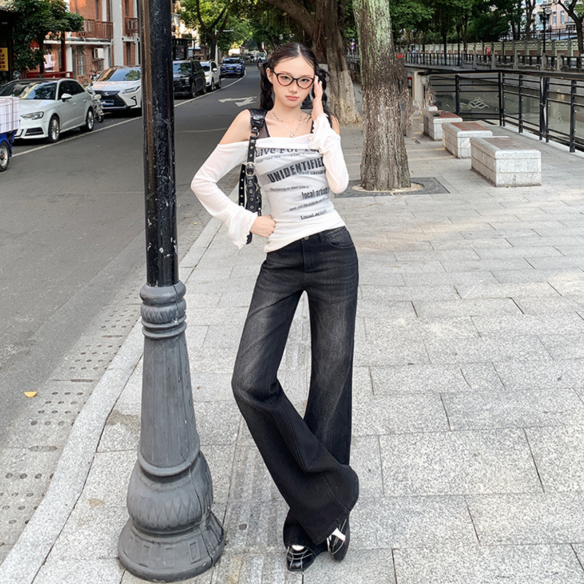四面弹丹宁色牛仔阔腿裤25年新款宽松显瘦牛仔长裤89173