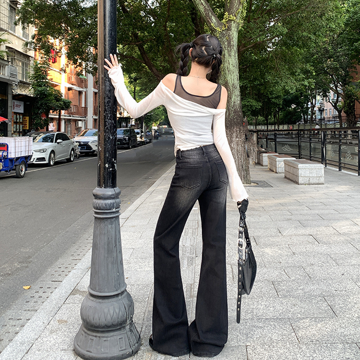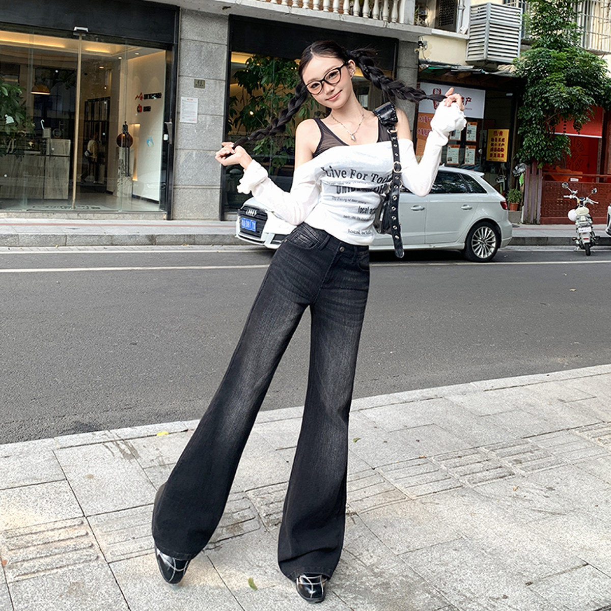 高品质美式黑色弹力修身微喇牛仔裤女辣妹显瘦版型好看的喇叭裤子