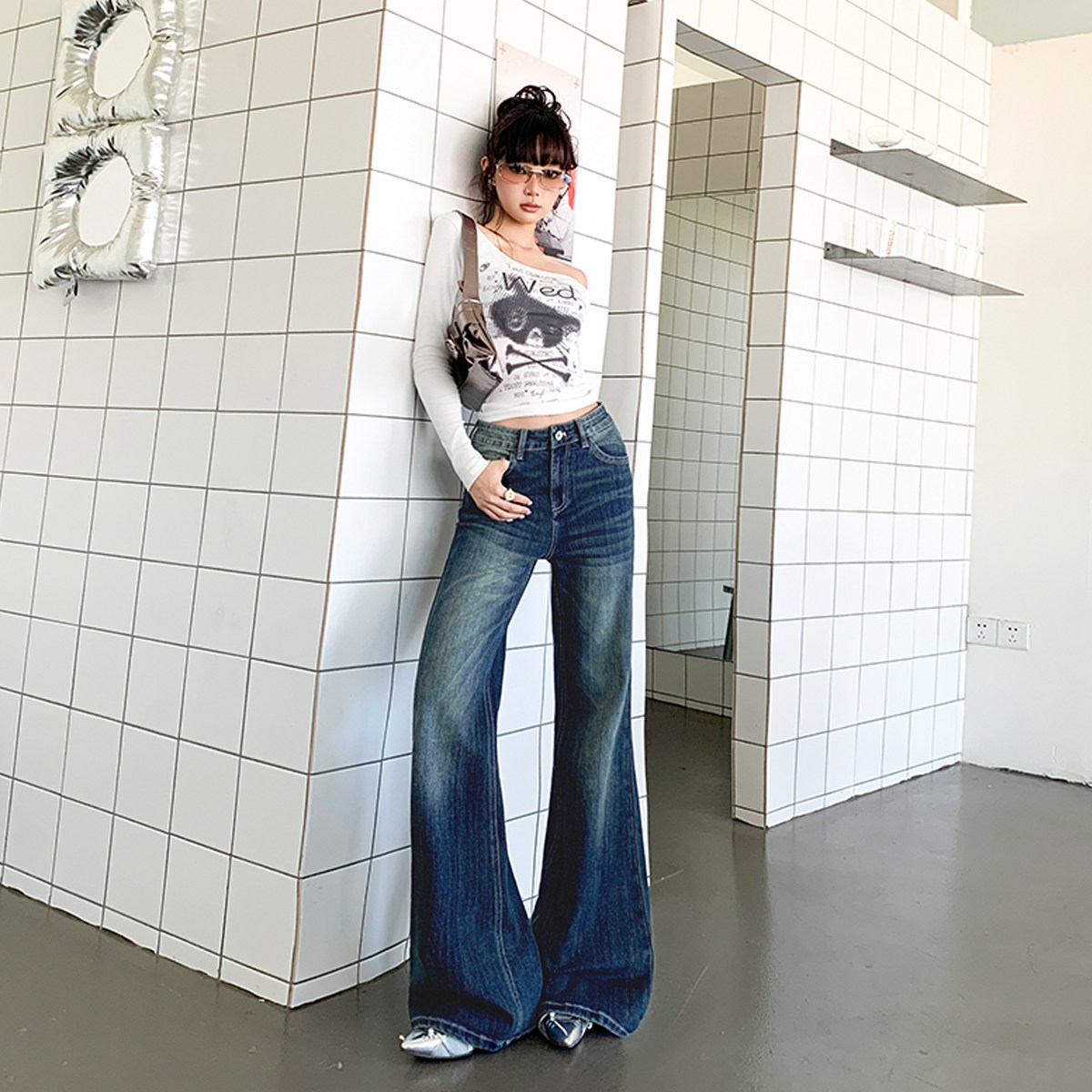 王家有鱼【古早蓝灰】2025秋季新款微喇牛仔裤中高腰不贴腿辣妹女