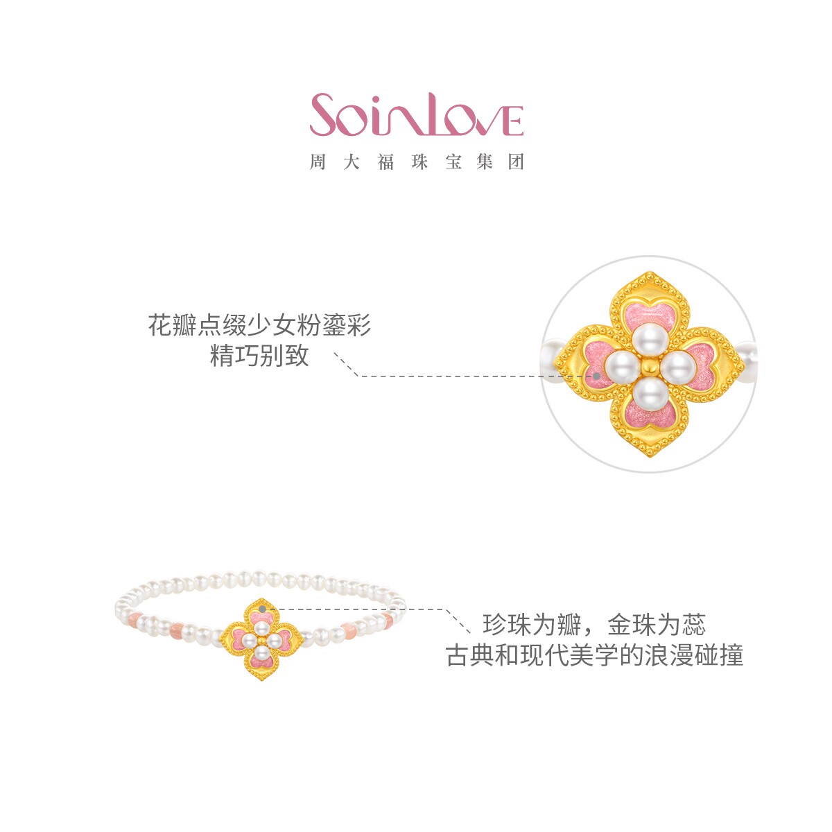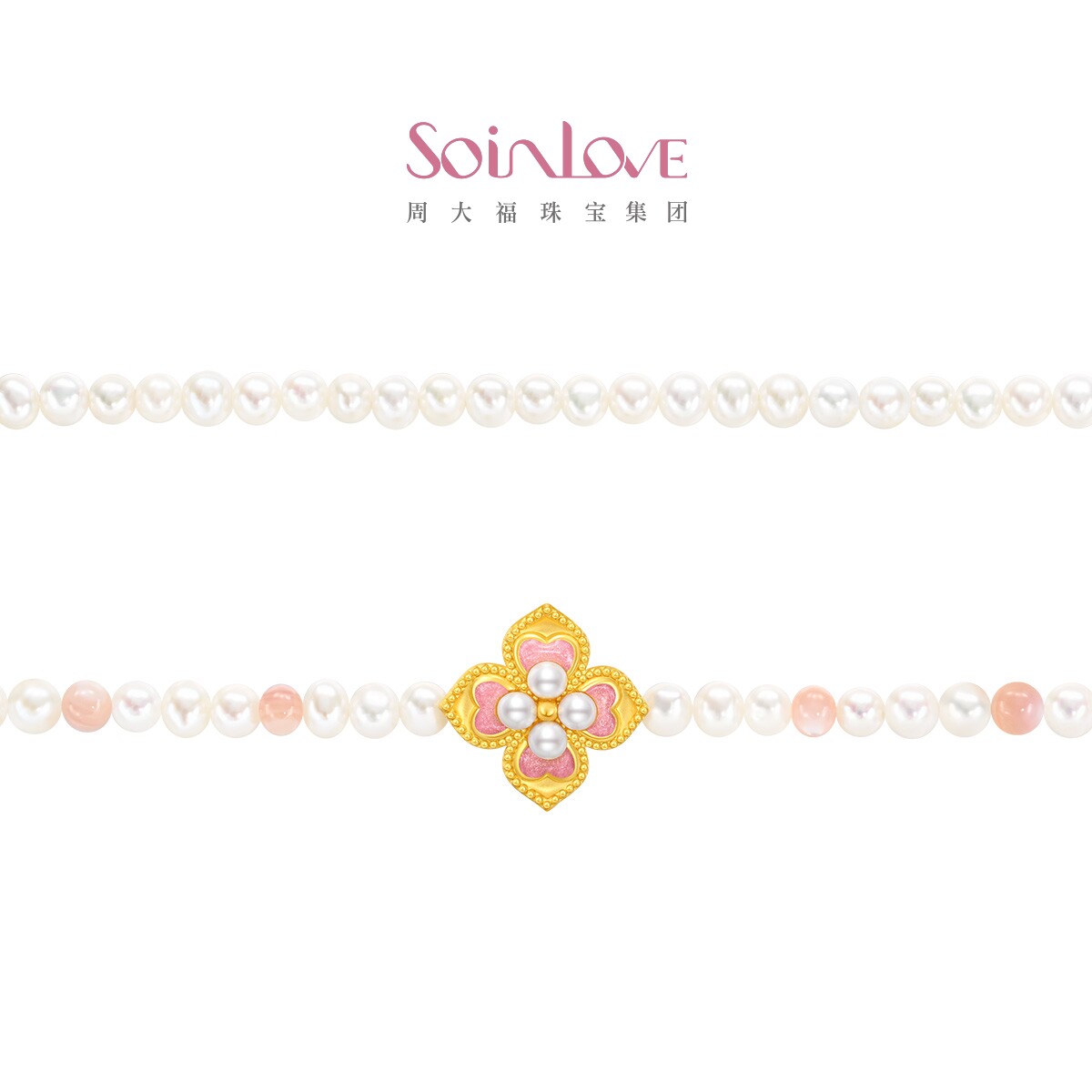 周大福SOINLOVE蜜粉金十里红妆芳华灼灼黄金珍珠粉贝手链VR1504
