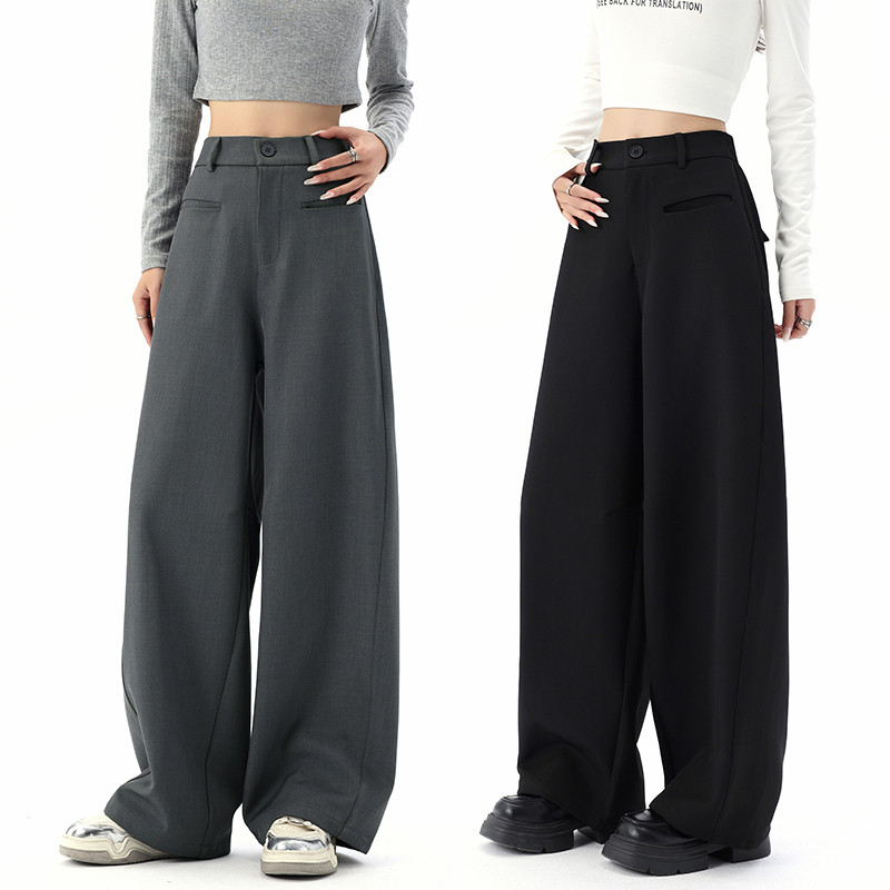 MissWiss直筒裤子女2025新款长裤休闲高腰收腹提臀黑色垂感阔腿裤