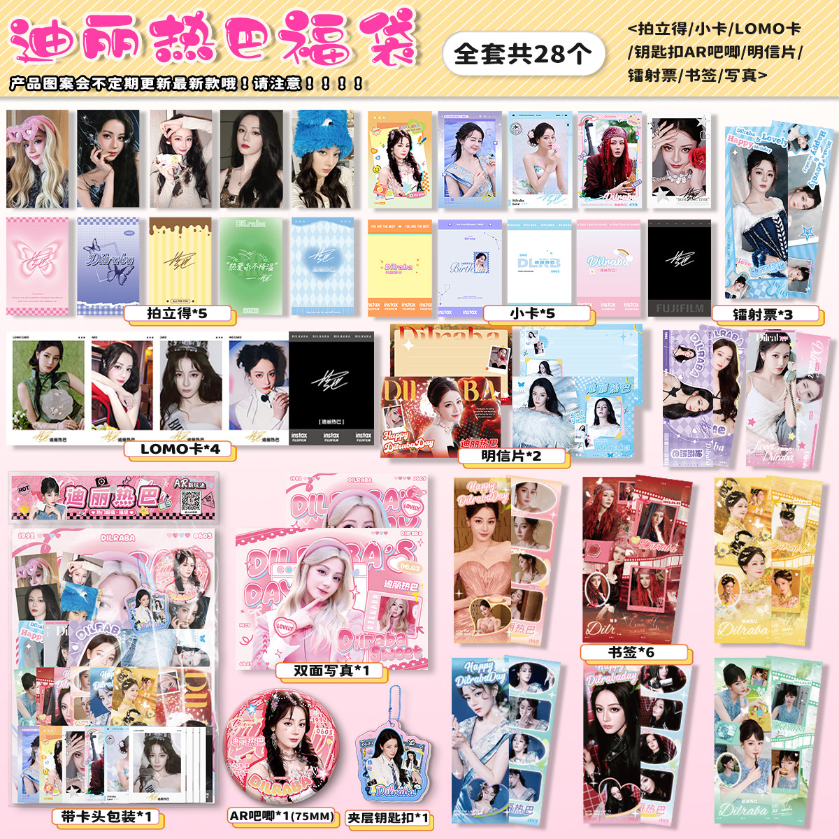 迪丽热巴周边83件福袋徽章小卡明信片拍立得钥匙扣LOMO卡海报时钟