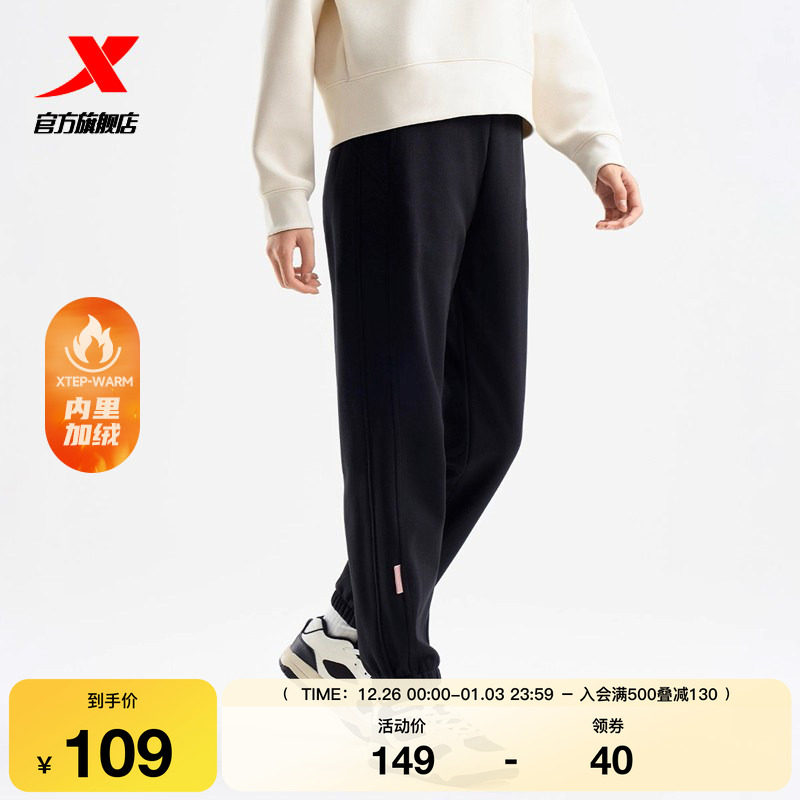 特步加绒卫裤女款冬季束脚裤黑色运动裤针织长裤保暖休闲裤