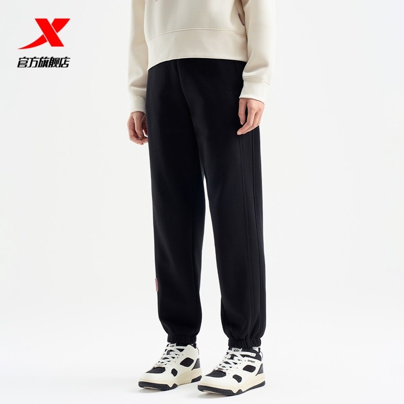 特步加绒卫裤女秋冬加厚款束脚裤针织裤休闲运动裤百搭黑色裤子