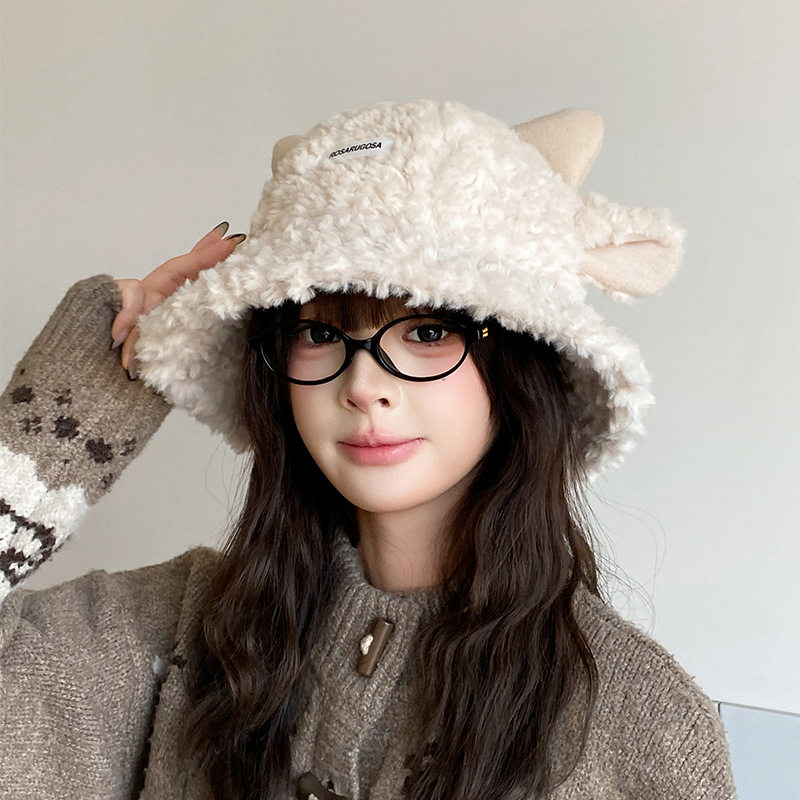 新款毛绒小羊渔夫帽子女秋冬季加厚保暖护耳盆帽可爱冬帽潮黑色