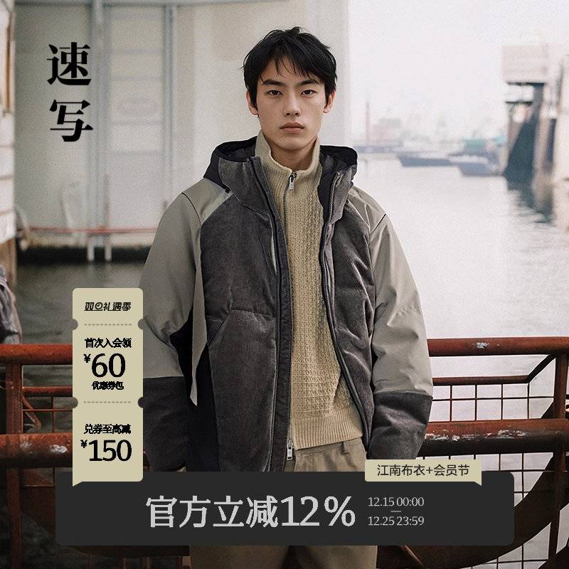 速写男装秋冬新款短款羽绒服连帽可拆卸拼接撞色保暖时尚设计外套