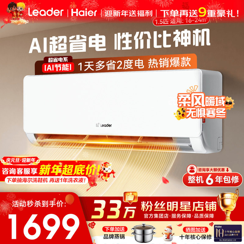 海尔空调1匹1.5匹2匹家用一级变频统帅卧室挂机冷暖省电LA1旗舰店