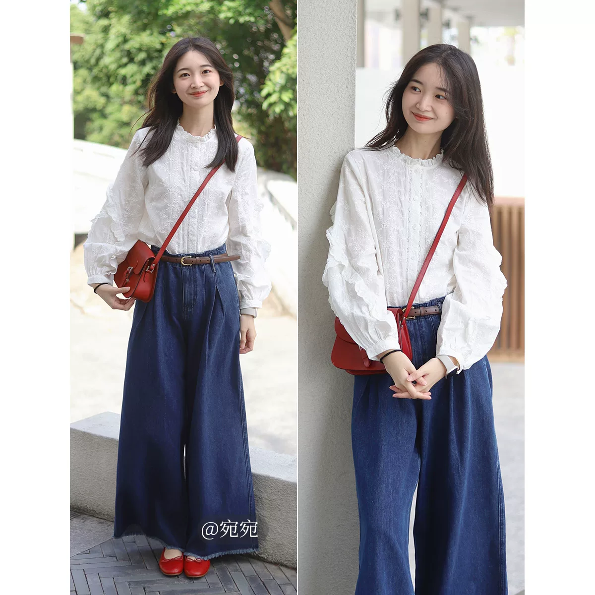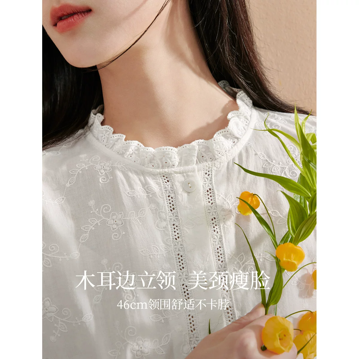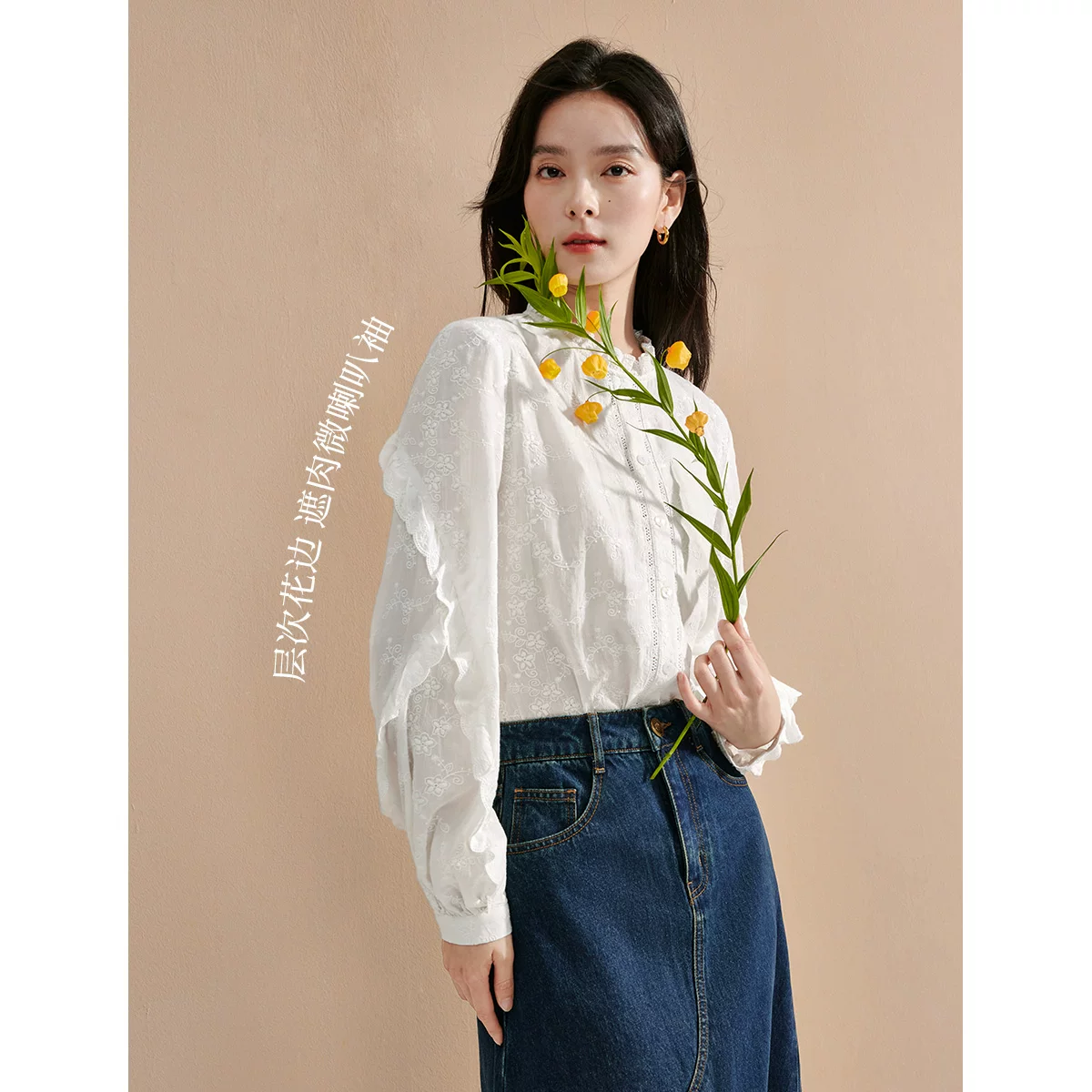 茵曼法式设计感荷叶袖立领衬衫女2025年春季新款重工绣花宽松上衣