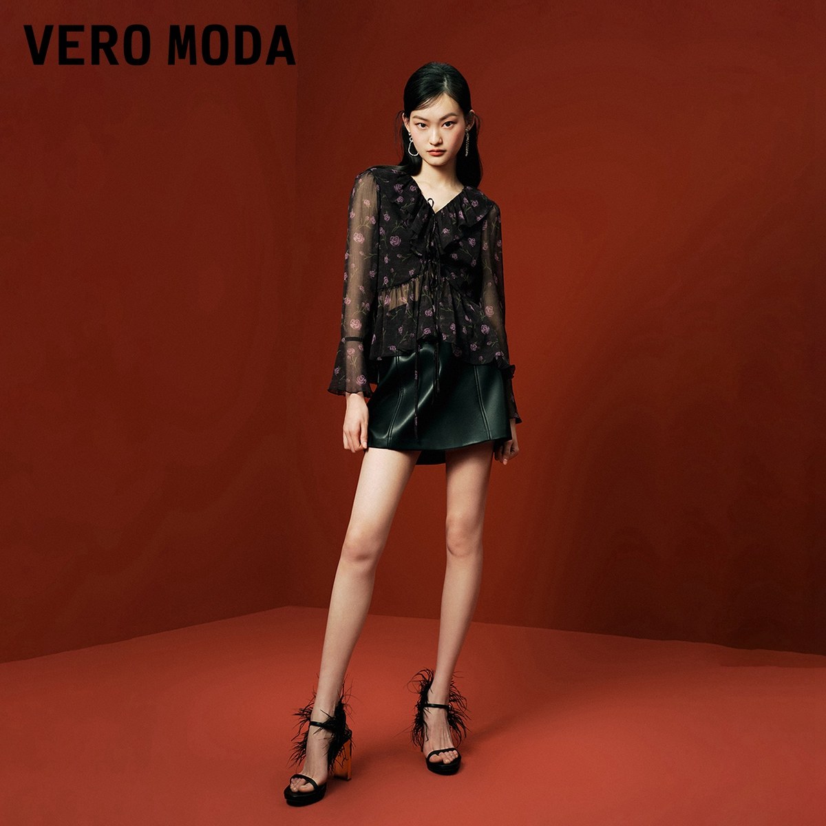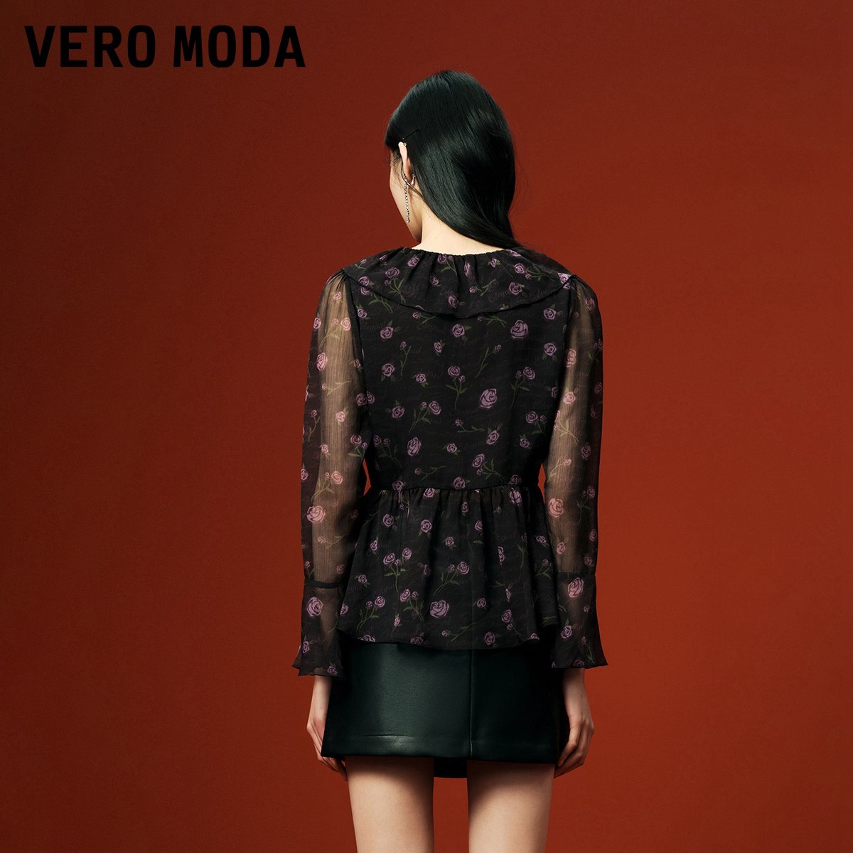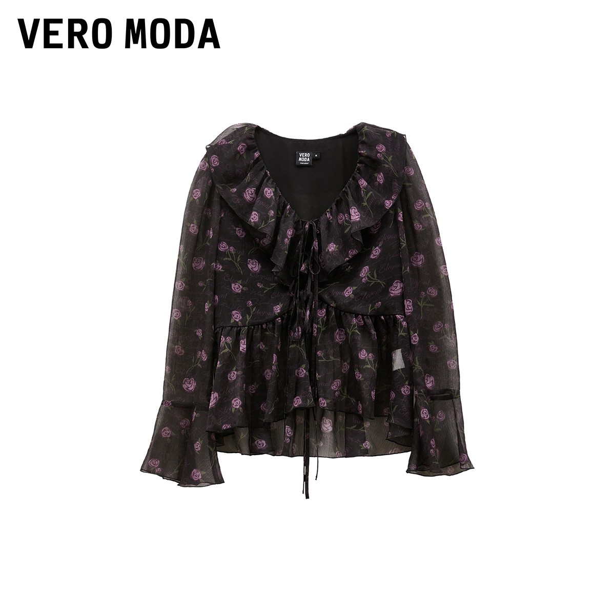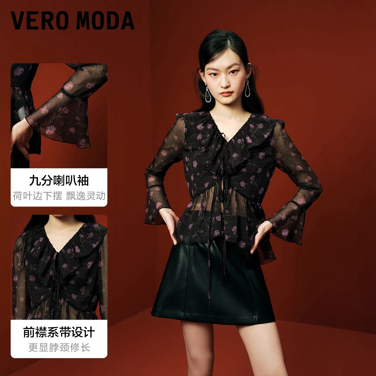 Vero Moda奥莱上衣女秋季新款玫瑰印花碎花V领透视气质雪纺衬衫