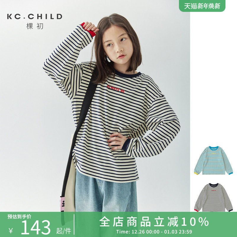 棵初2026春中大女童经典条纹长袖T恤亲子装圆领撞色字母套头衫