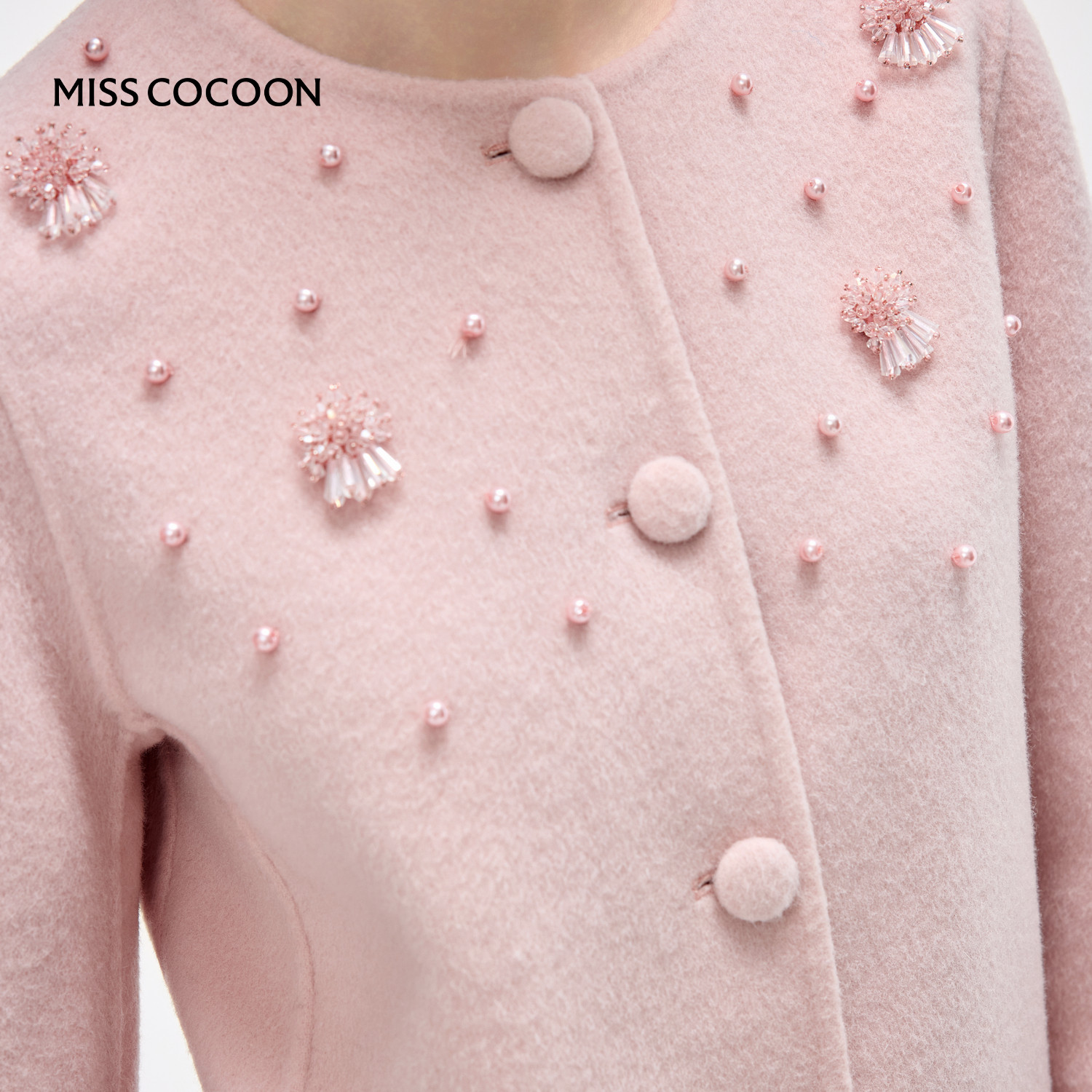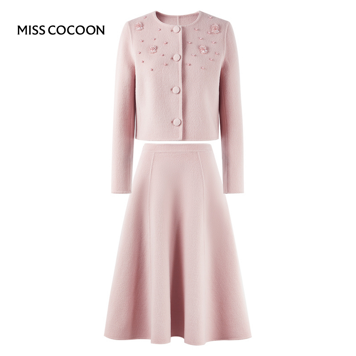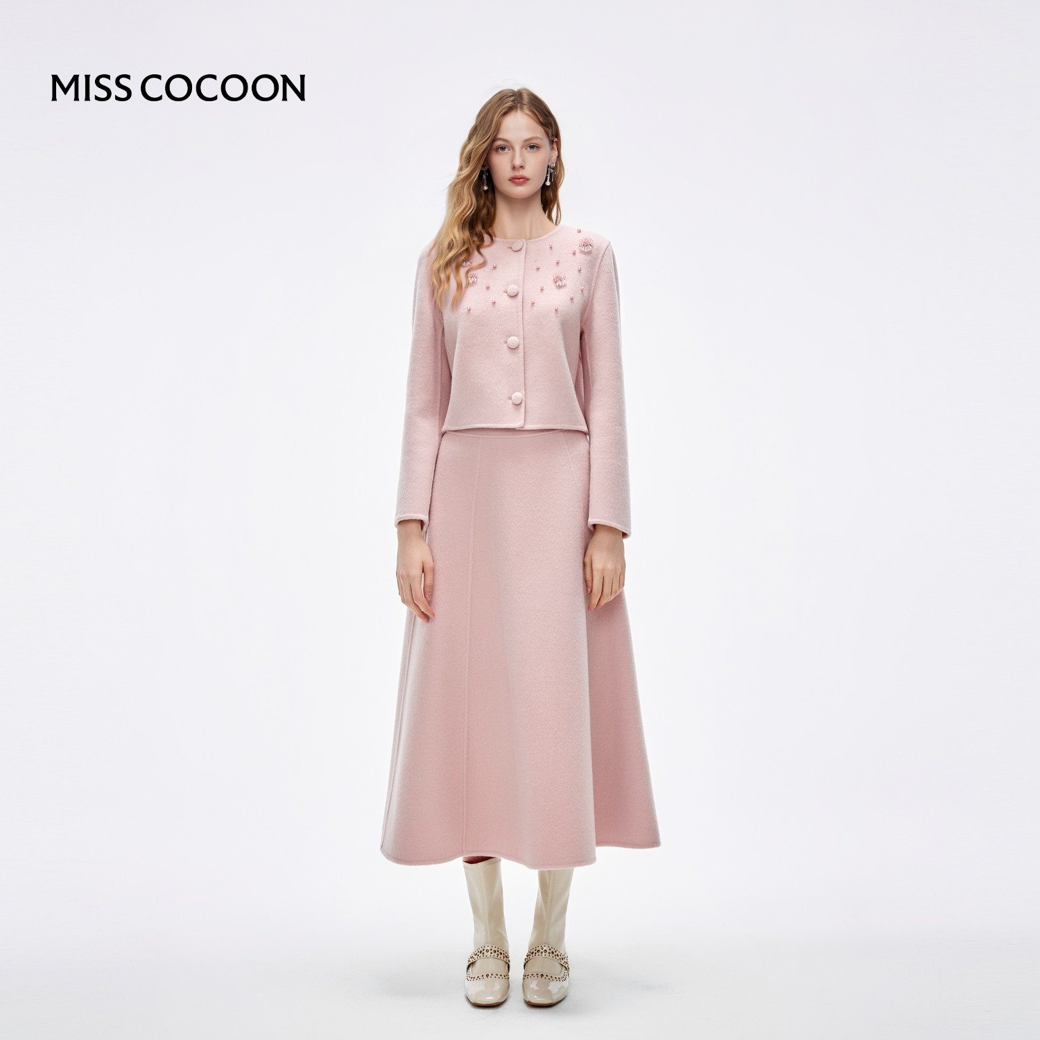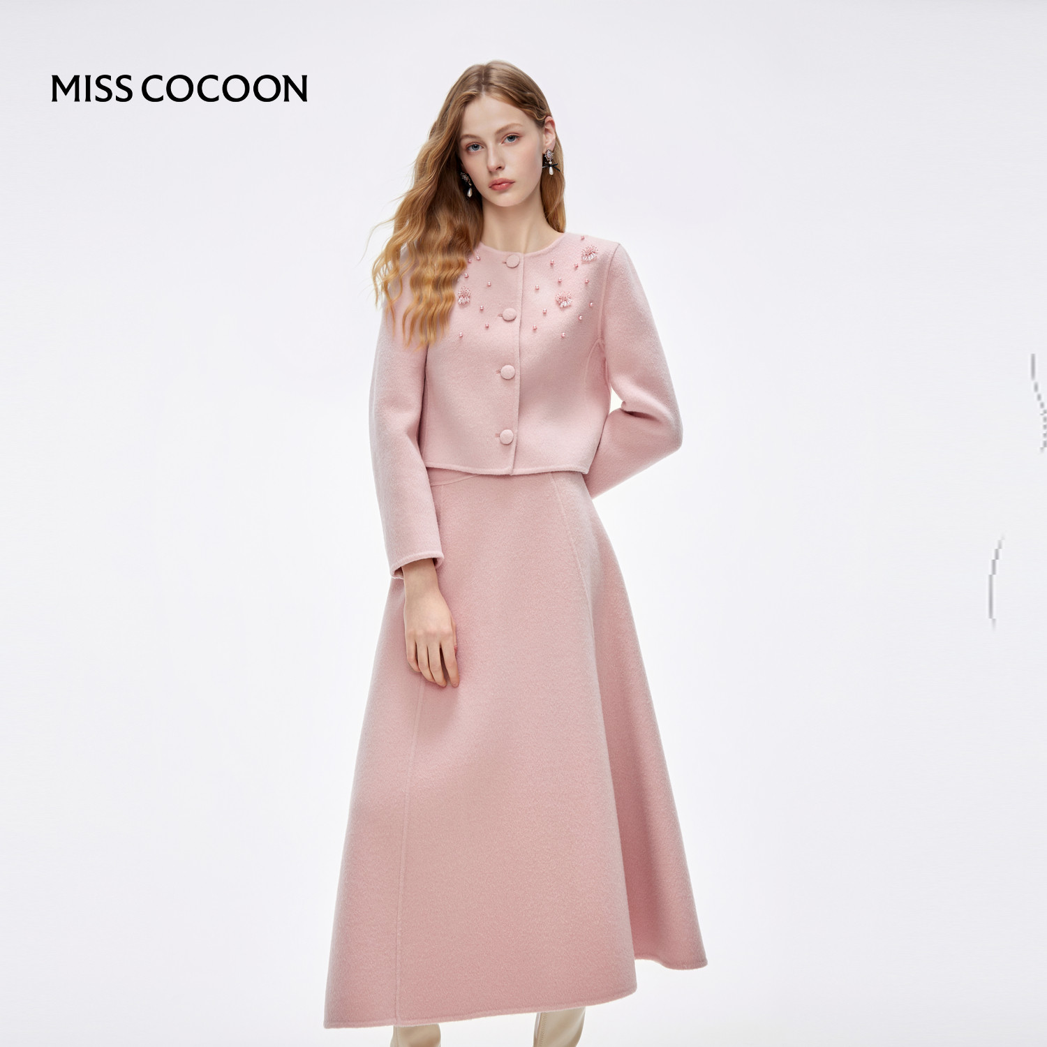 MISSCOCOON可可尼粉色套装裙女2025冬季新款小香风双面呢短外套