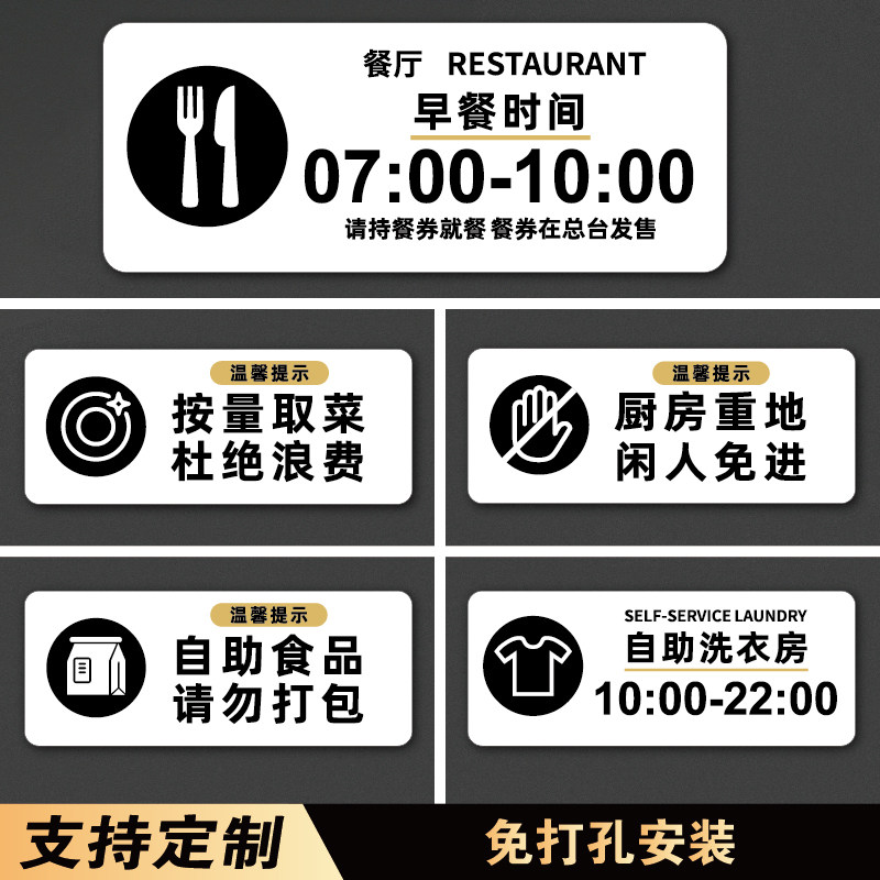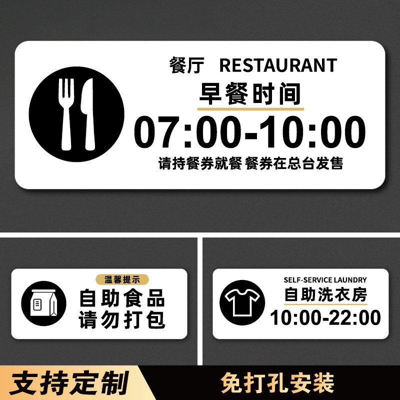亚克力标识牌定制民宿酒店早餐用餐时间提示牌餐厅持餐券就餐标识牌自助洗衣房时间提醒牌自助食品请勿打包贴