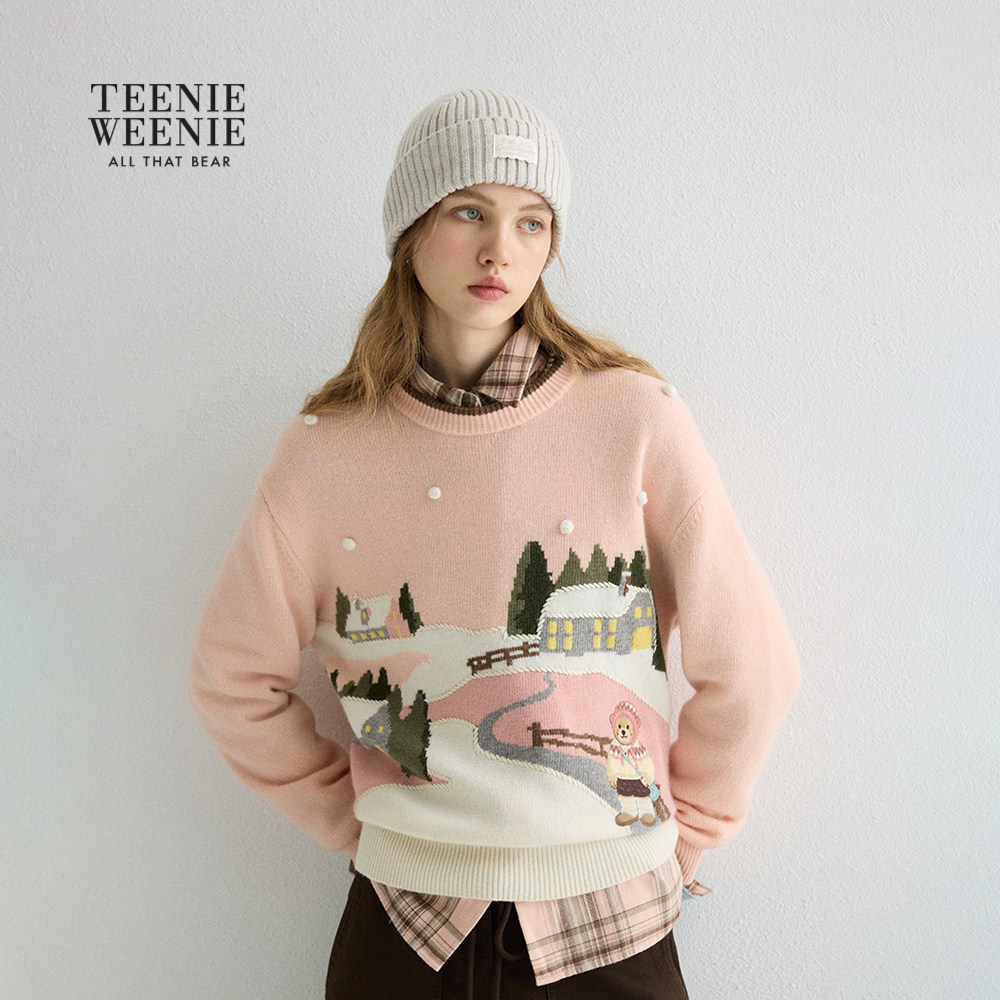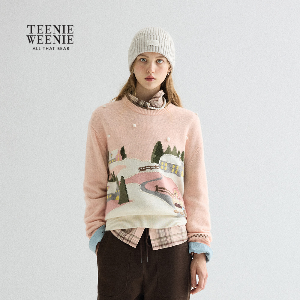 TeenieWeenie小熊女装绵羊毛针织衫2025冬季新款时尚撞色圆领毛衣
