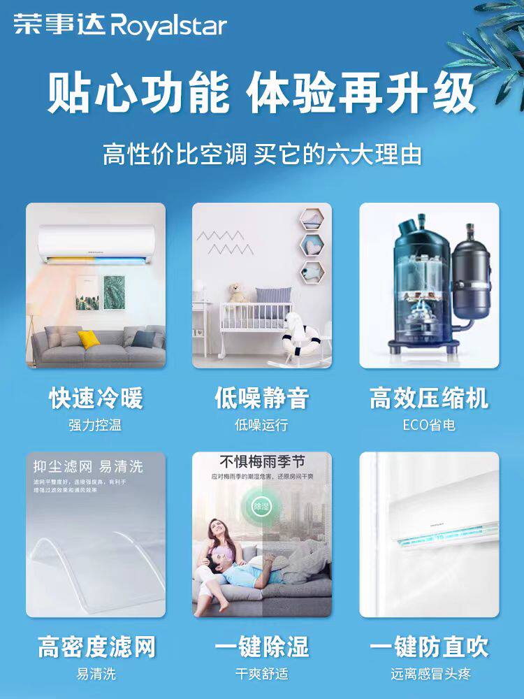 荣事达空调1P/大1.5P/2匹家用卧室壁挂式单冷暖变频一级节能挂机