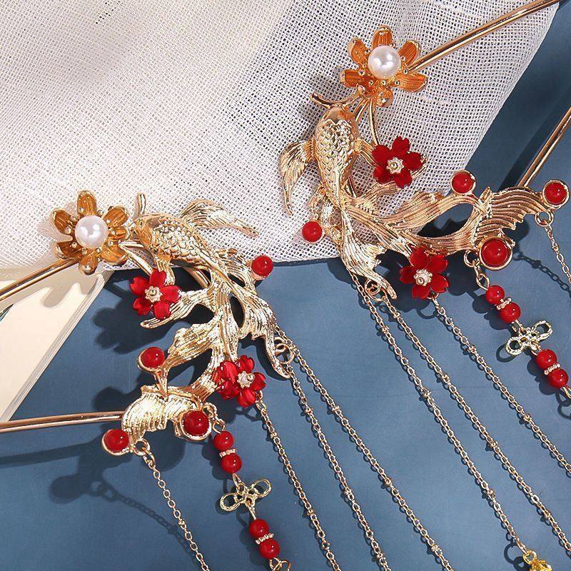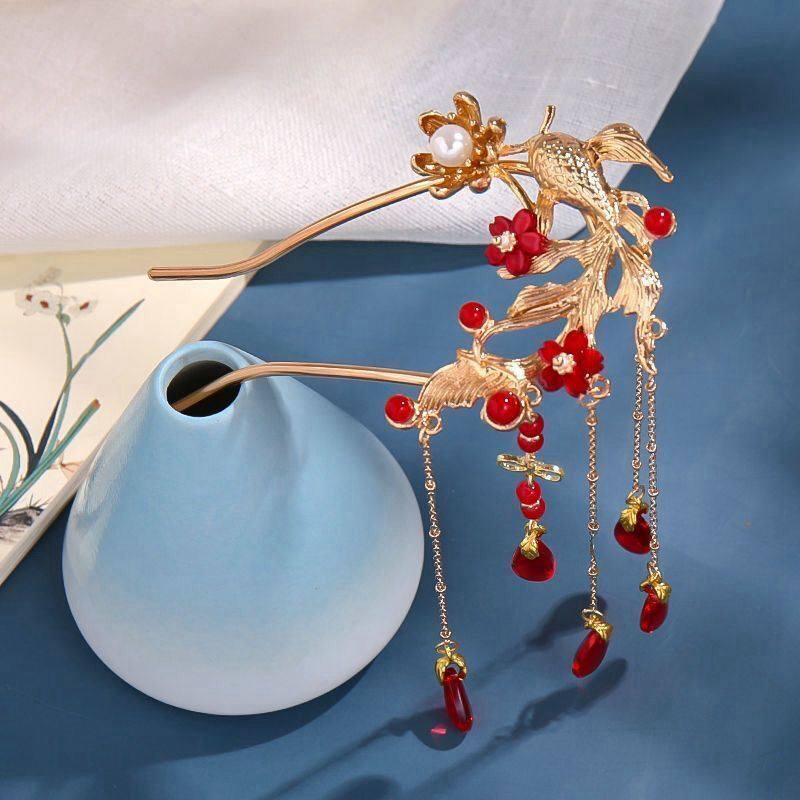 红色发簪结婚凤钗流苏步摇古风u型簪子新款发饰马面裙头饰发钗女i