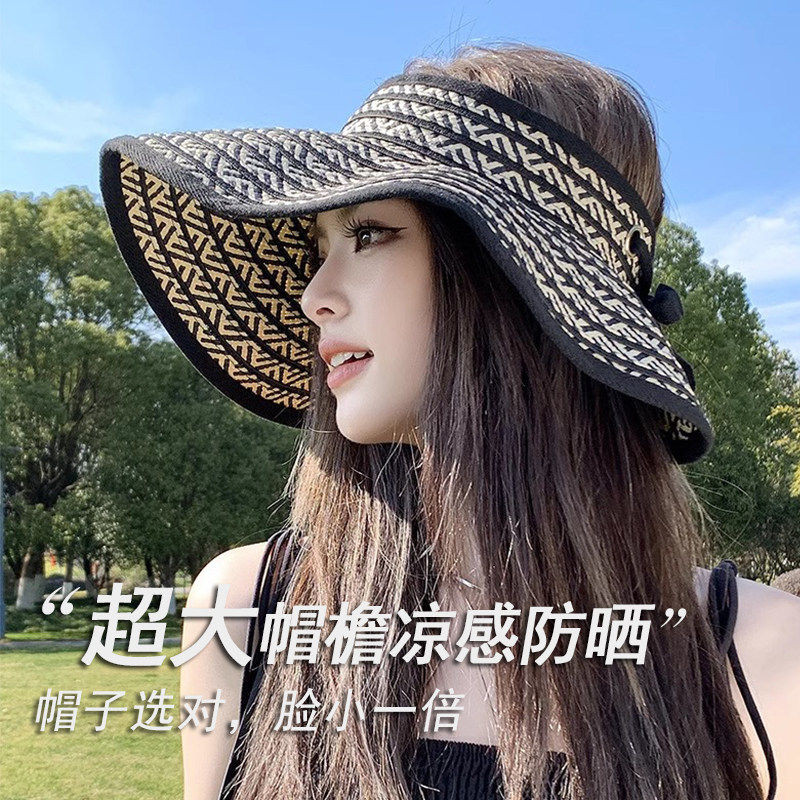 大帽檐夏季防紫外线空顶防晒帽女太阳帽子遮阳草帽遮脸可折叠草编