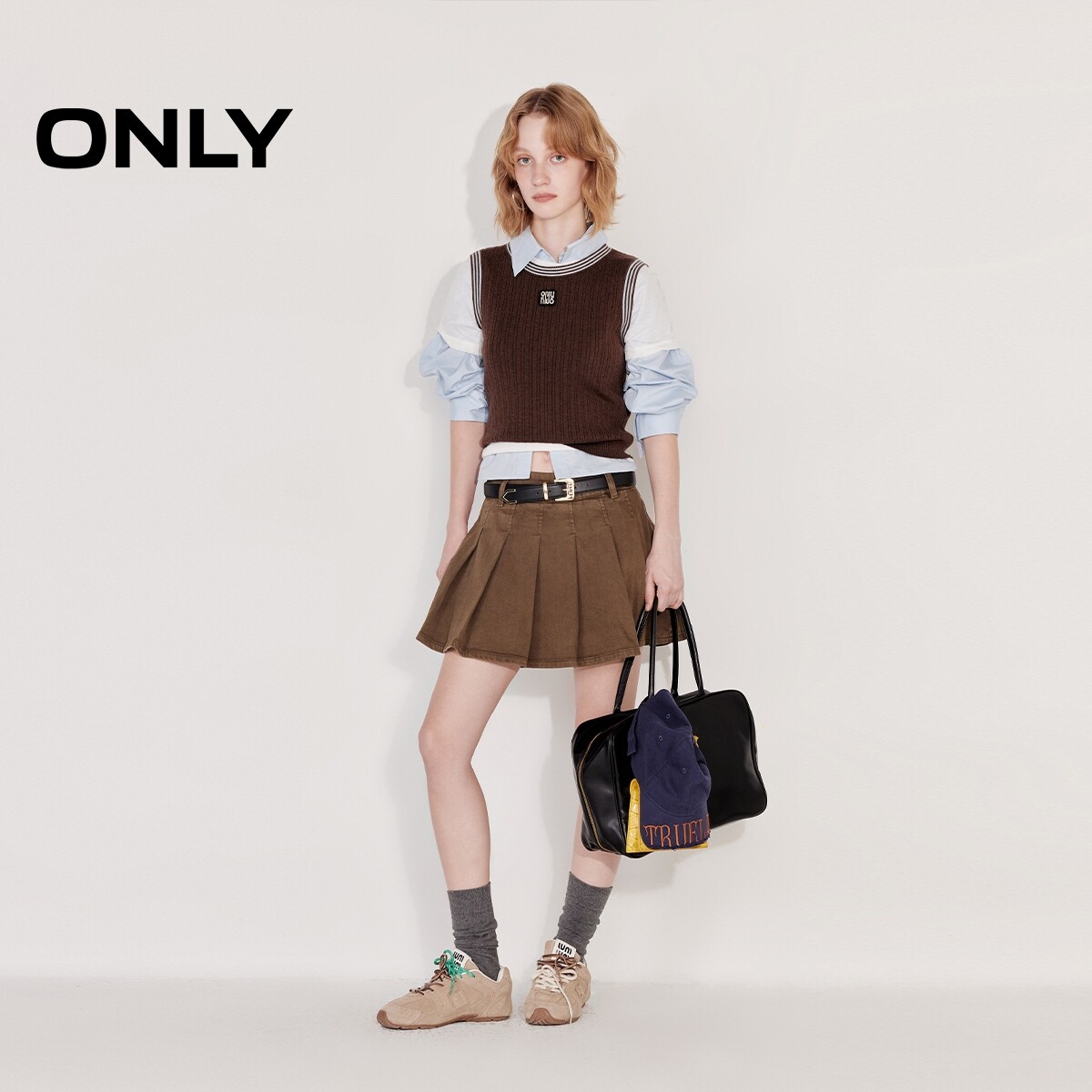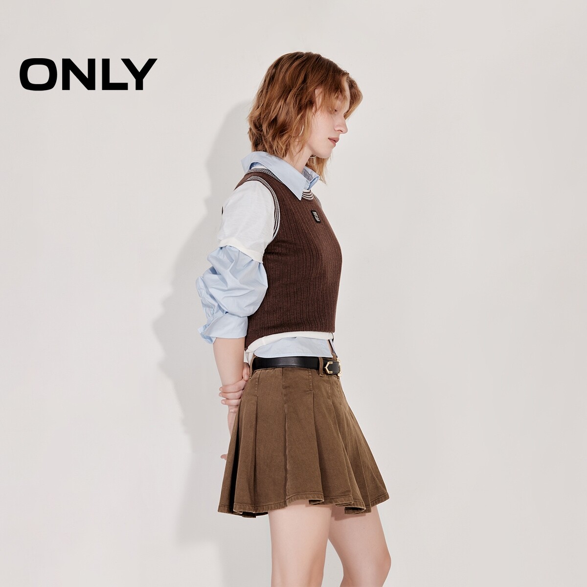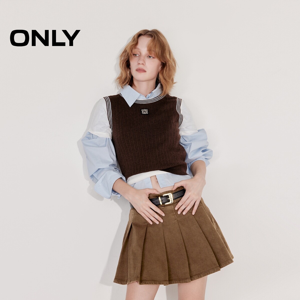 【ONLY奥莱】春款减龄学院风腰带A字显瘦百褶裙短裙牛仔半身裙女