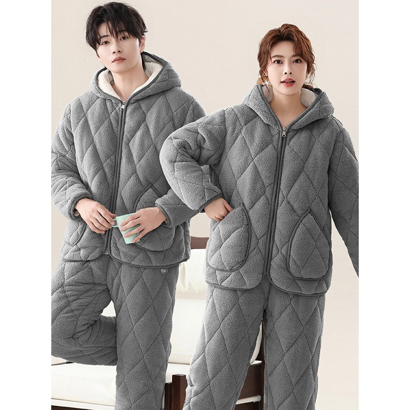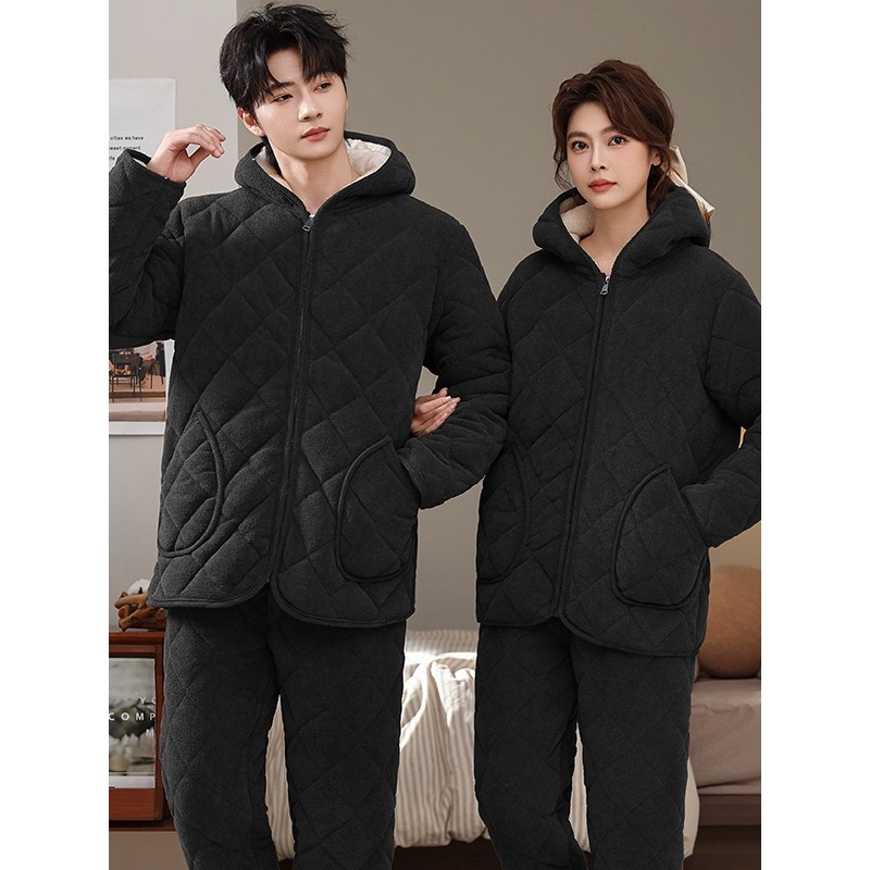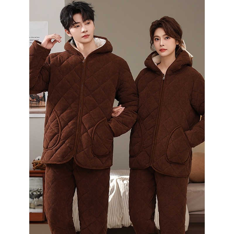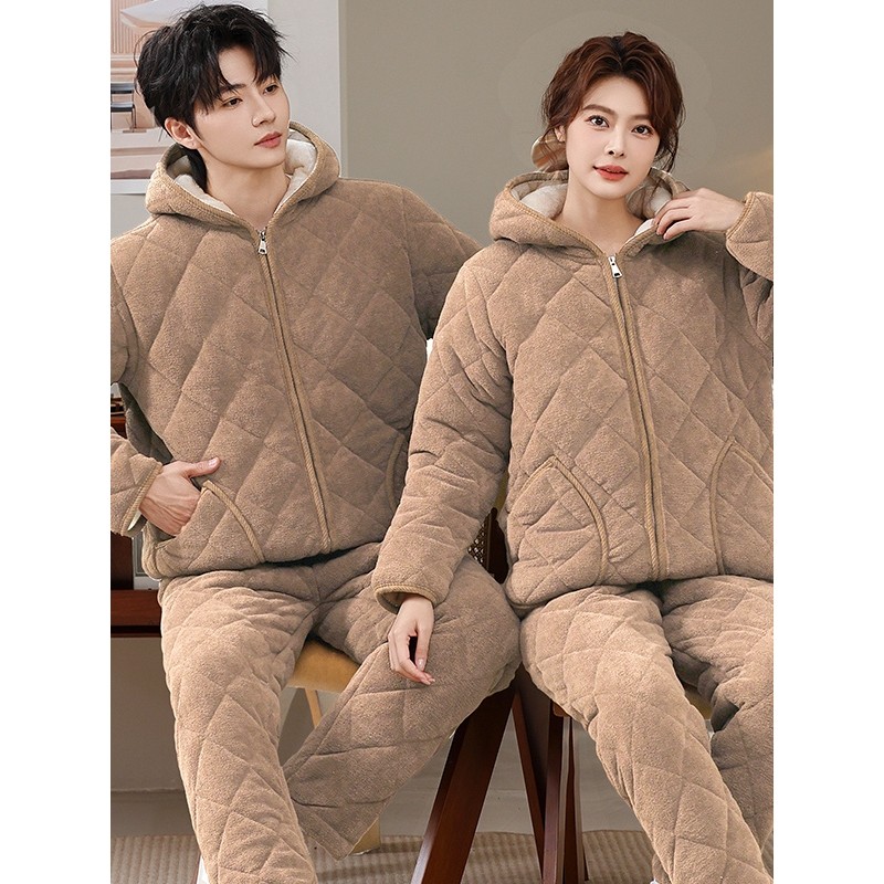 红豆连帽情侣睡衣冬季女士加绒加厚三层夹棉保暖男士套装珊瑚绒家