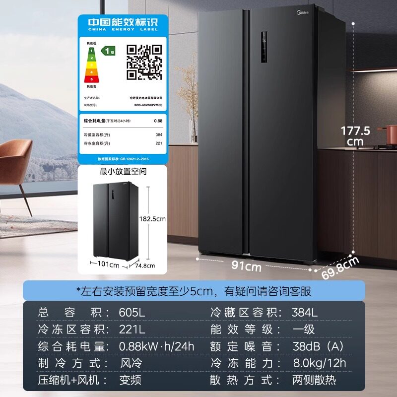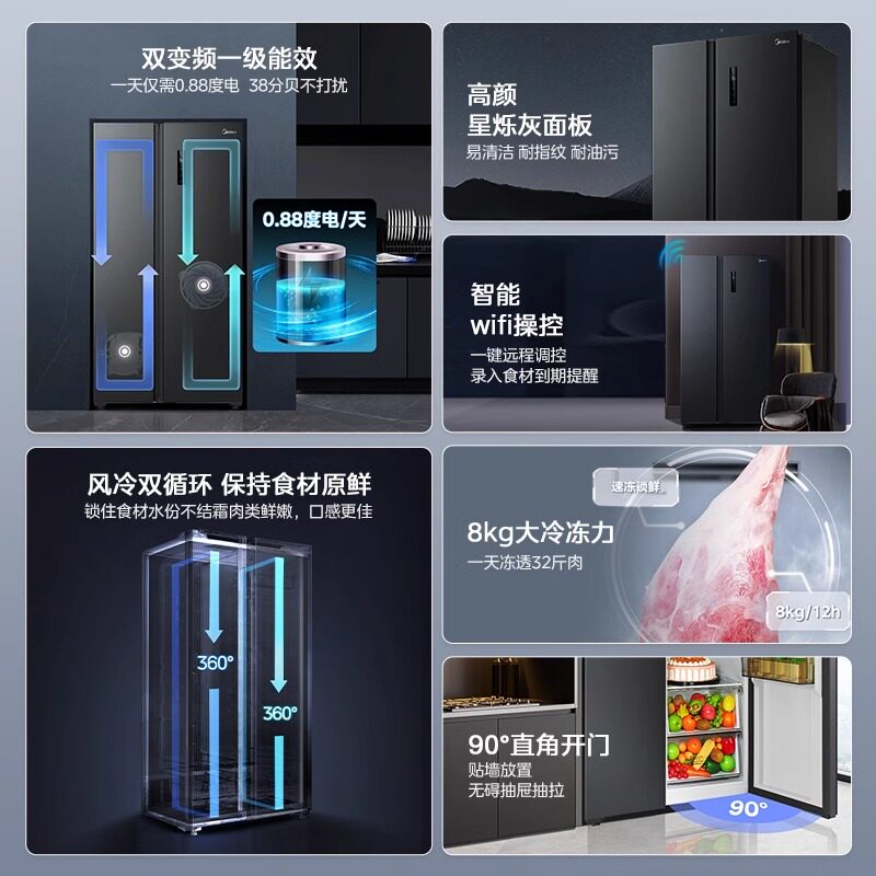 美的570+/606对开双开门两门大容量家用冰箱一级节能风冷无霜超薄
