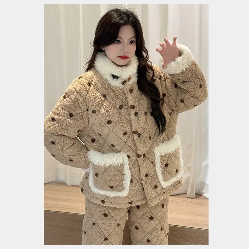 睡衣女款秋冬季加绒加厚珊瑚绒立领纽扣保暖三层夹棉可外穿家居服