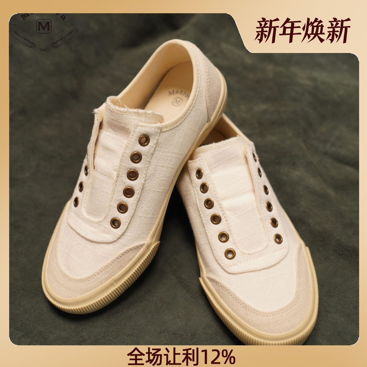 曼托瓦mantova低帮小白鞋一脚蹬平底休闲懒人鞋亚麻低帮帆布鞋女