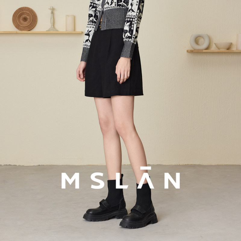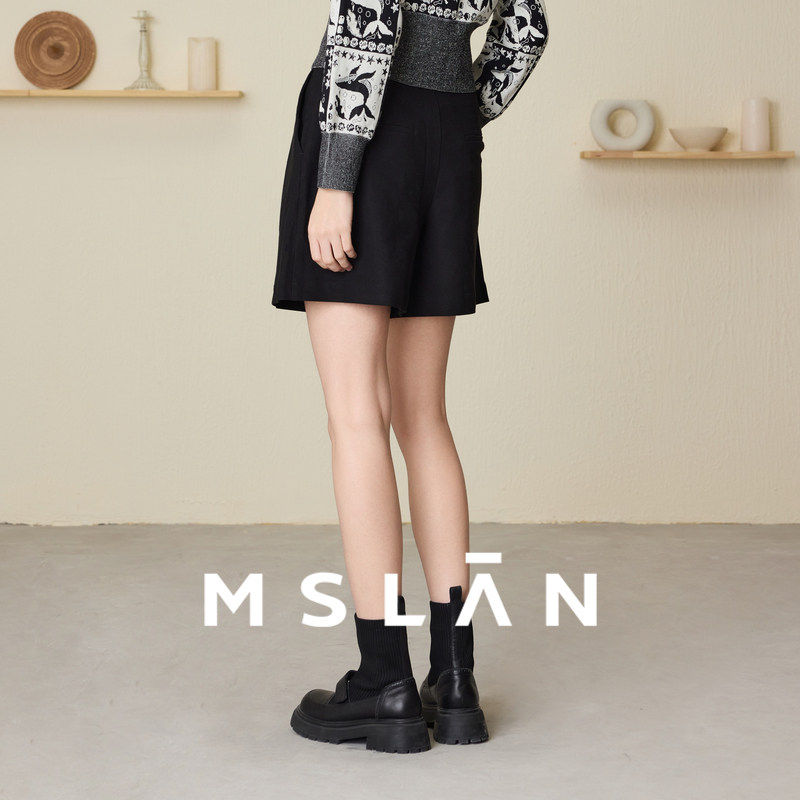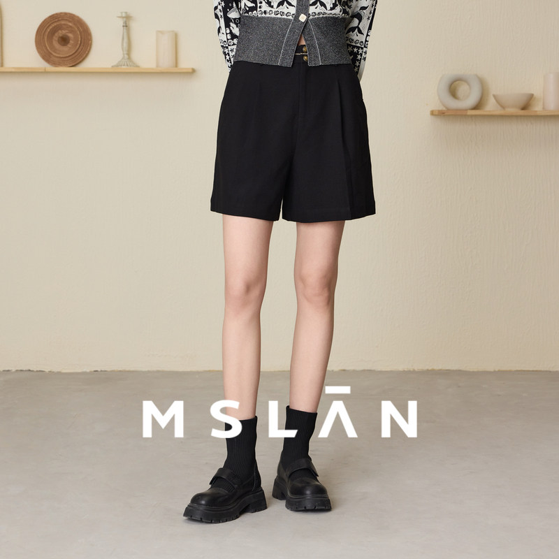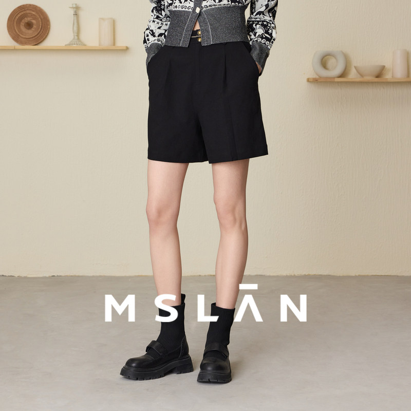 【发热保暖】MSLAN春季复古A字黑色高腰宽松显瘦短裤MEDM6102